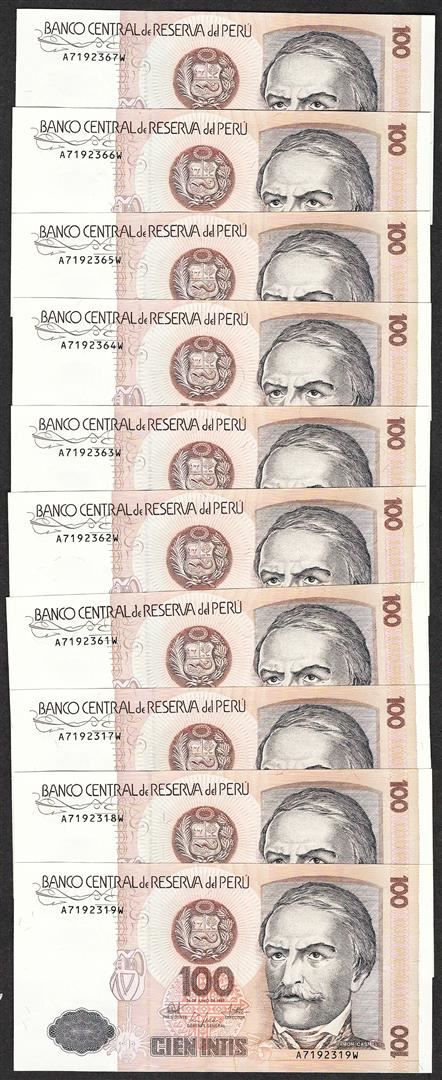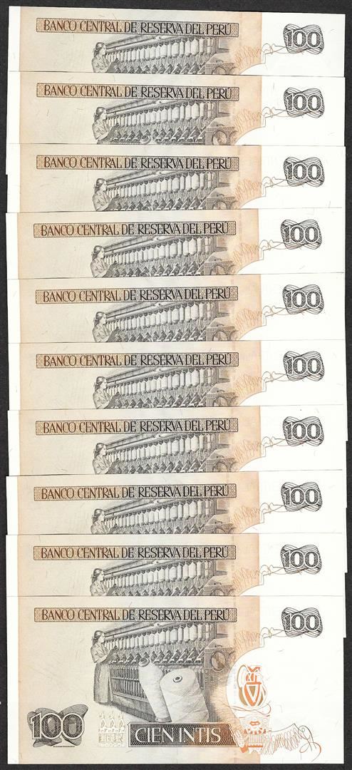 One Lot of (10) 1987 Peru Cien Intis Uncirculated Bank Notes.