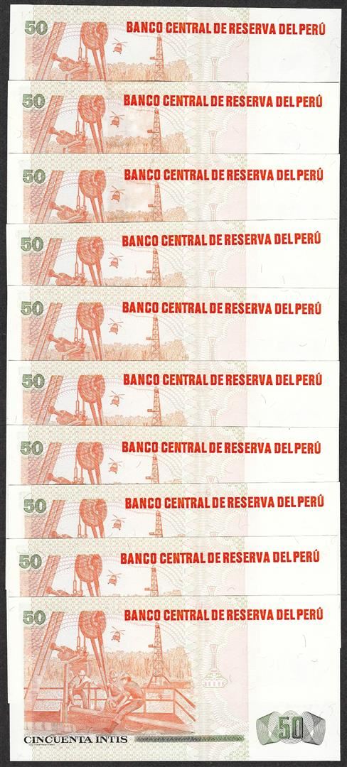 One Lot of (10) 1987 Peru Cincuenta Intis Uncirculated Bank Notes.