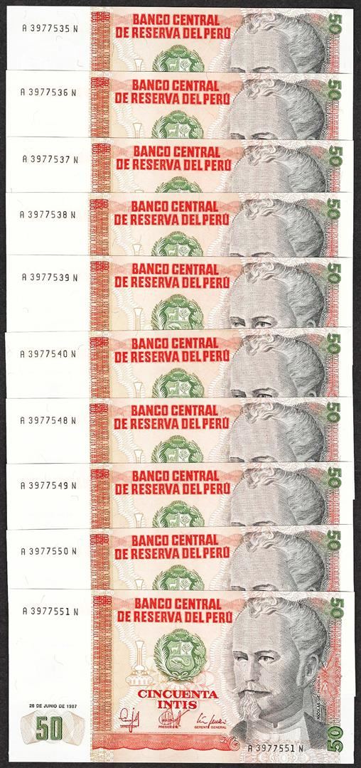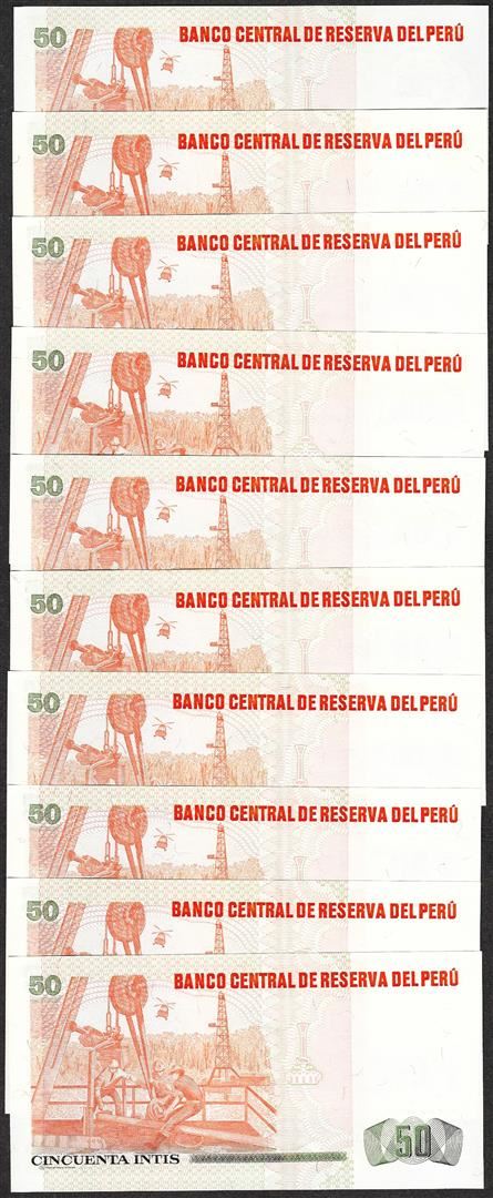 One Lot of (10) 1987 Peru Cincuenta Intis Uncirculated Bank Notes.