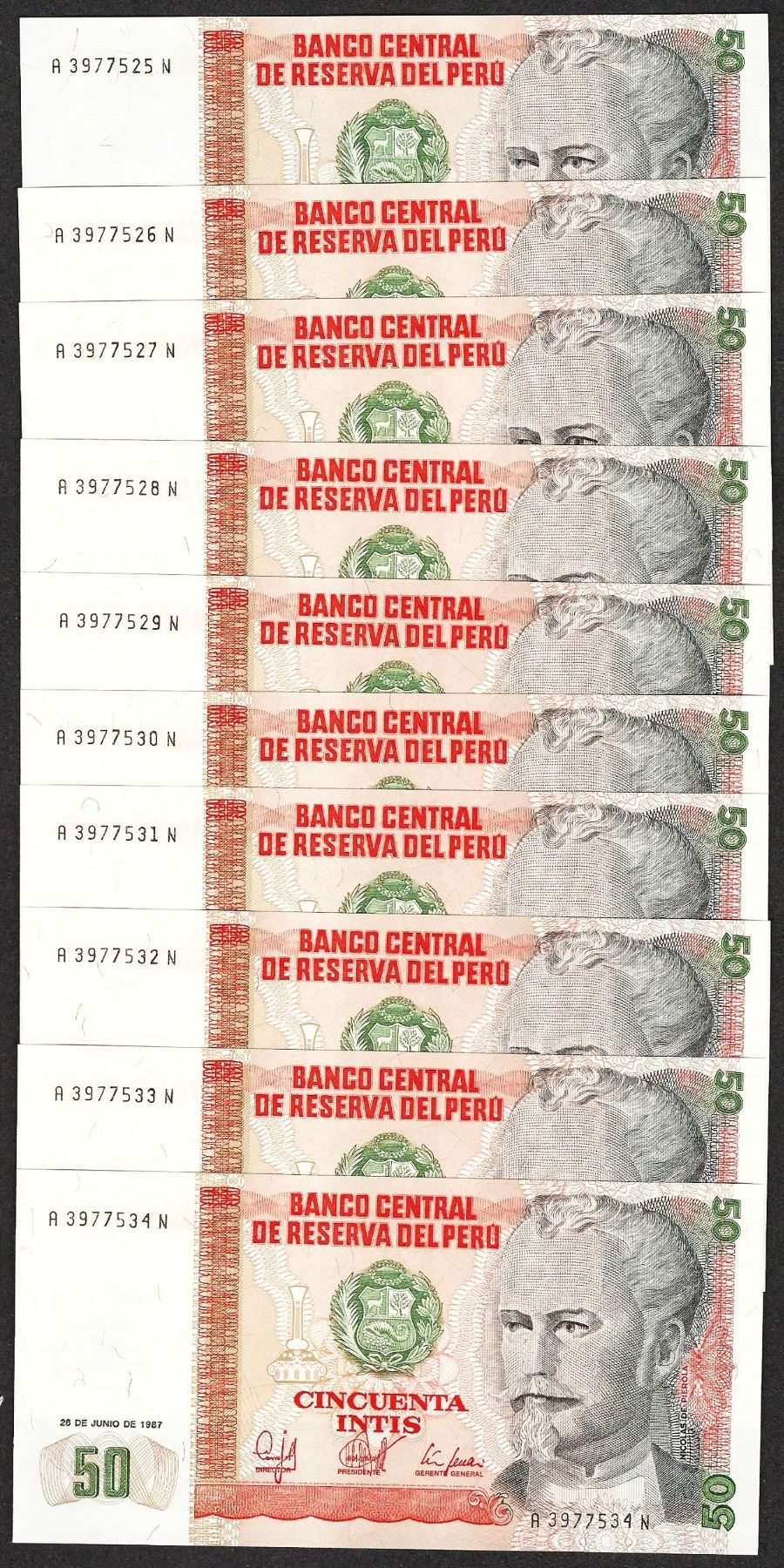 One Lot of (10) 1987 Peru Cincuenta Intis Uncirculated Bank Notes.