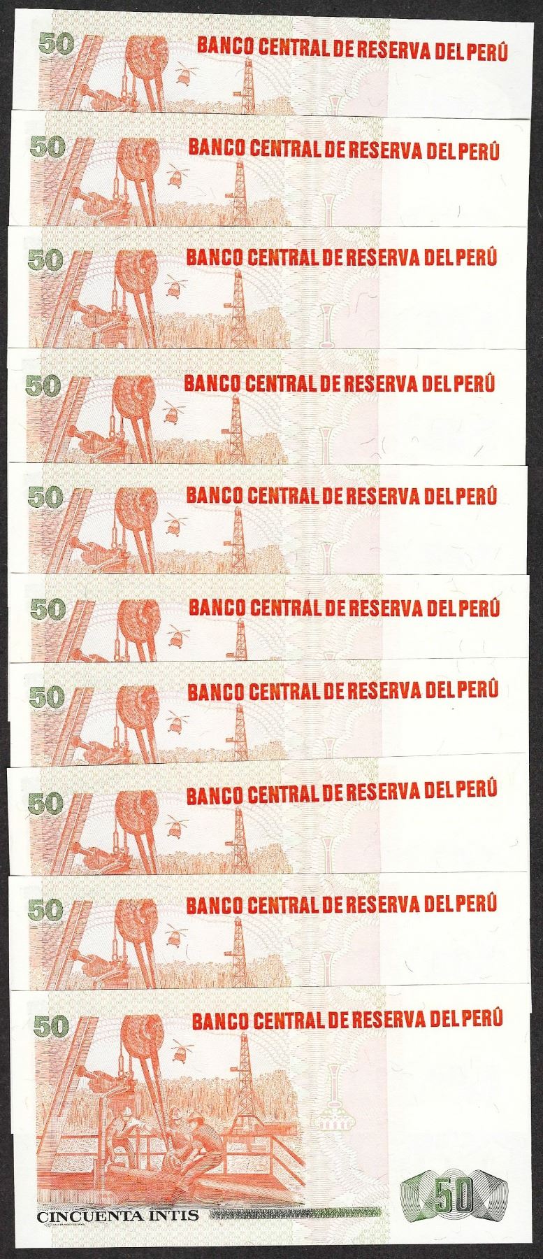 Lot of (10) 1987 Peru Cincuenta Intis Uncirculated Bank Notes