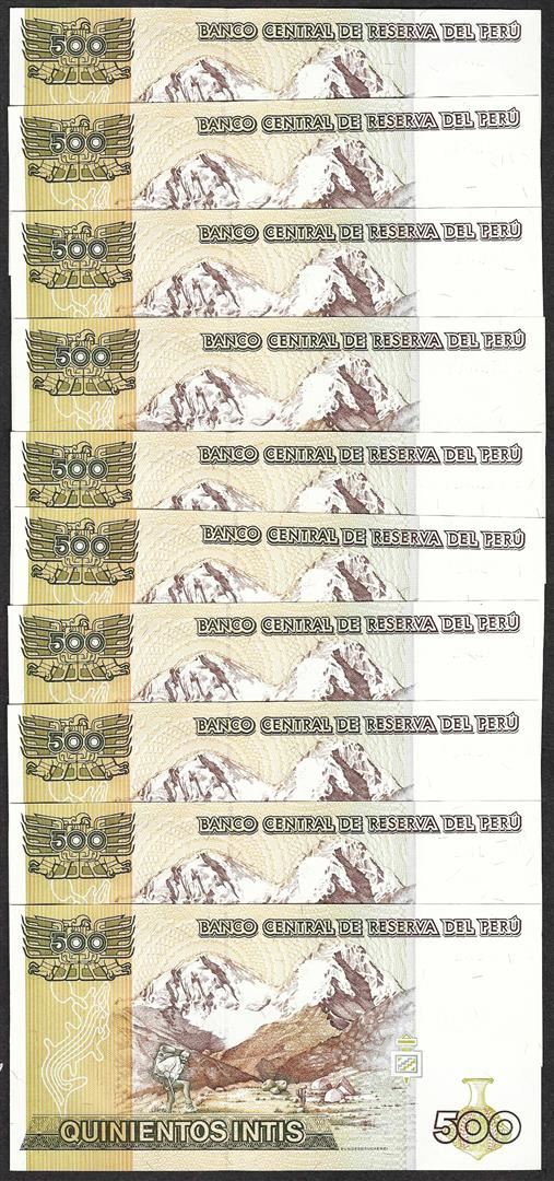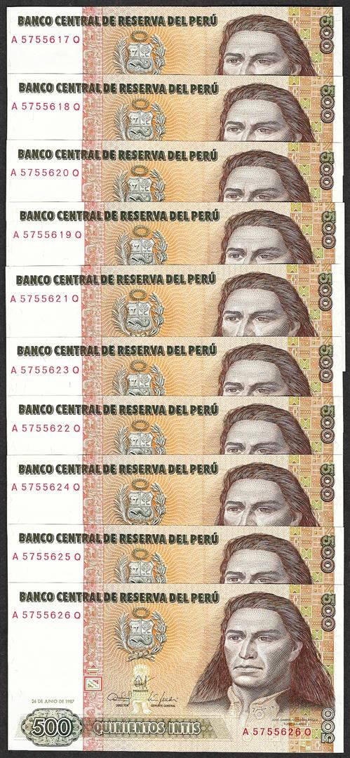 One Lot of (10) 1987 Peru Quinientos Intis Uncirculated Bank Notes.