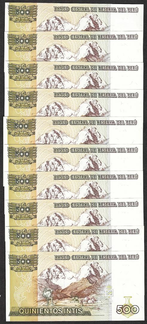 One Lot of (10) 1987 Peru Quinientos Intis Uncirculated Bank Notes.