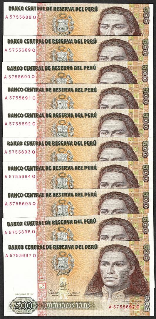 One Lot of (10) 1987 Peru Quinientos Intis Uncirculated Bank Notes.
