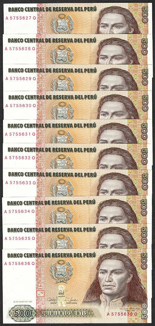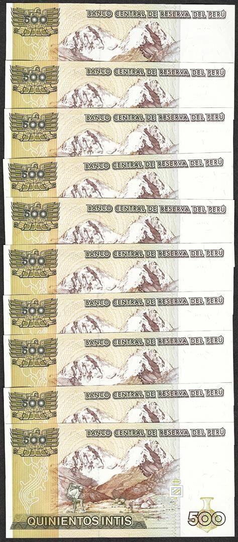 One Lot of (10) 1987 Peru Quinientos Intis Uncirculated Bank Notes.