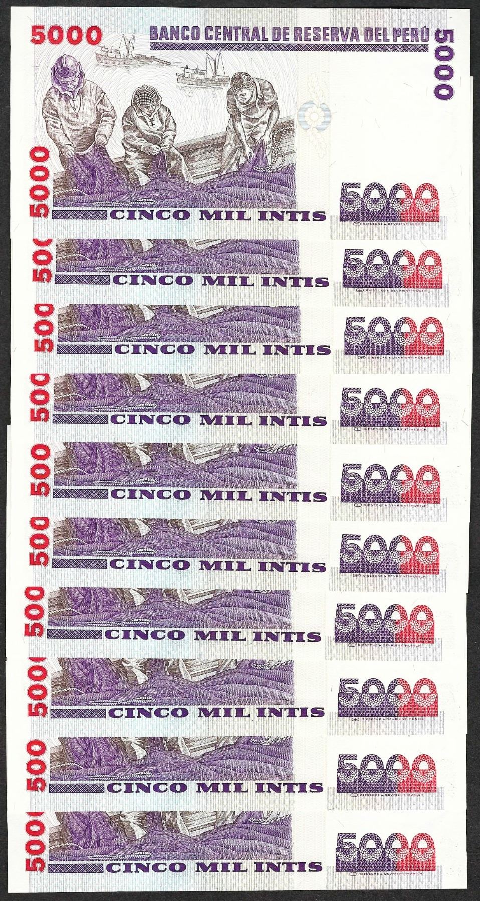 Lot of (10) 1988 Peru Cinco Mil Intis Uncirculated Bank Notes