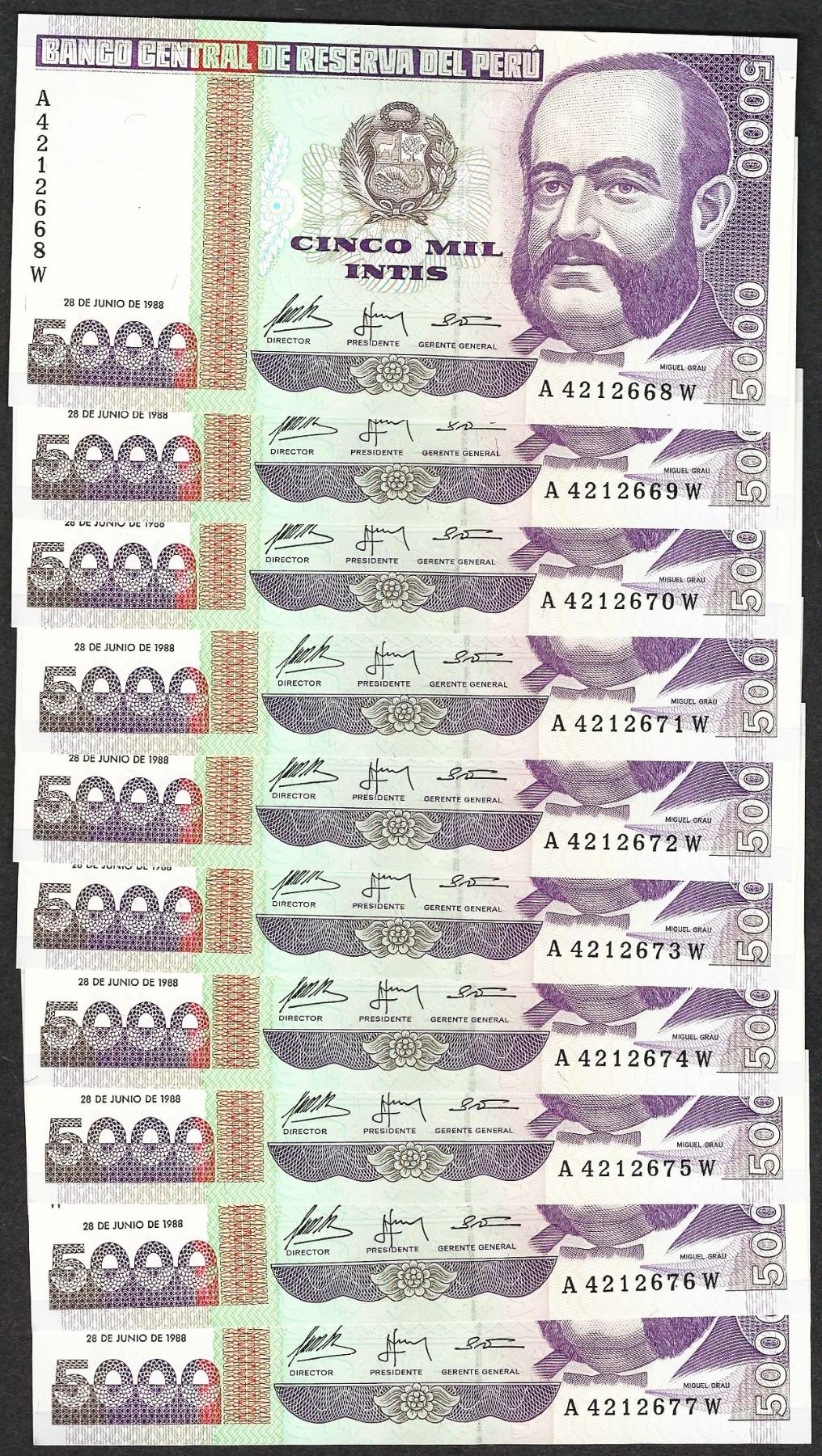 One Lot of (10) 1988 Peru Cinco Mil Intis Uncirculated Bank Notes.