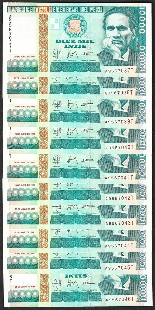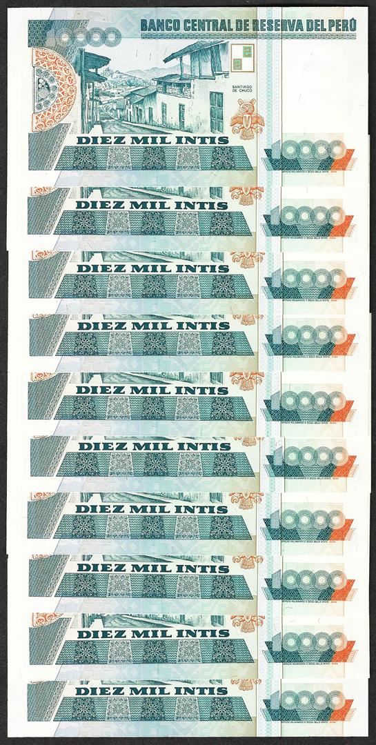 One Lot of (10) 1988 Peru Diez Mil Intis Uncirculated Bank Notes.