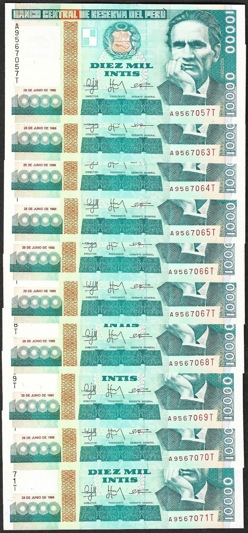 One Lot of (10) 1988 Peru Diez Mil Intis Uncirculated Bank Notes.