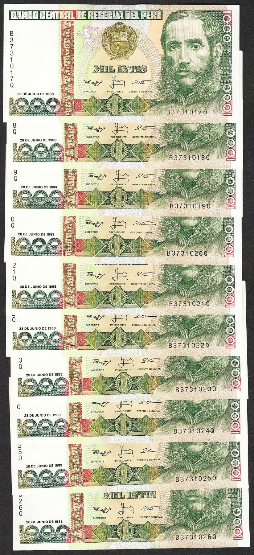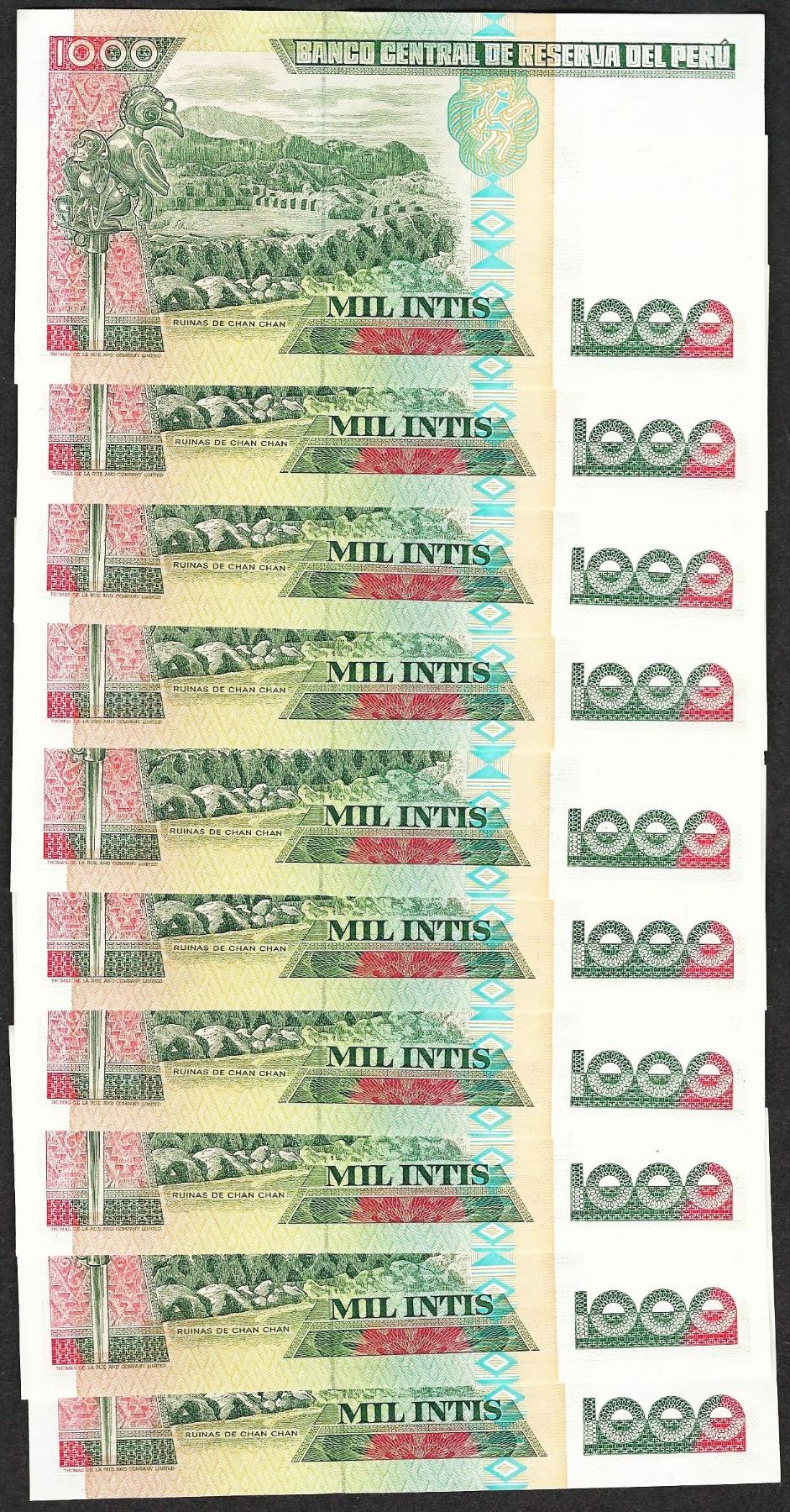 One Lot of (10) 1988 Peru Mil Intis Uncirculated Bank Notes.