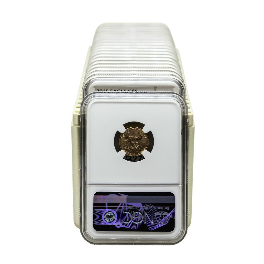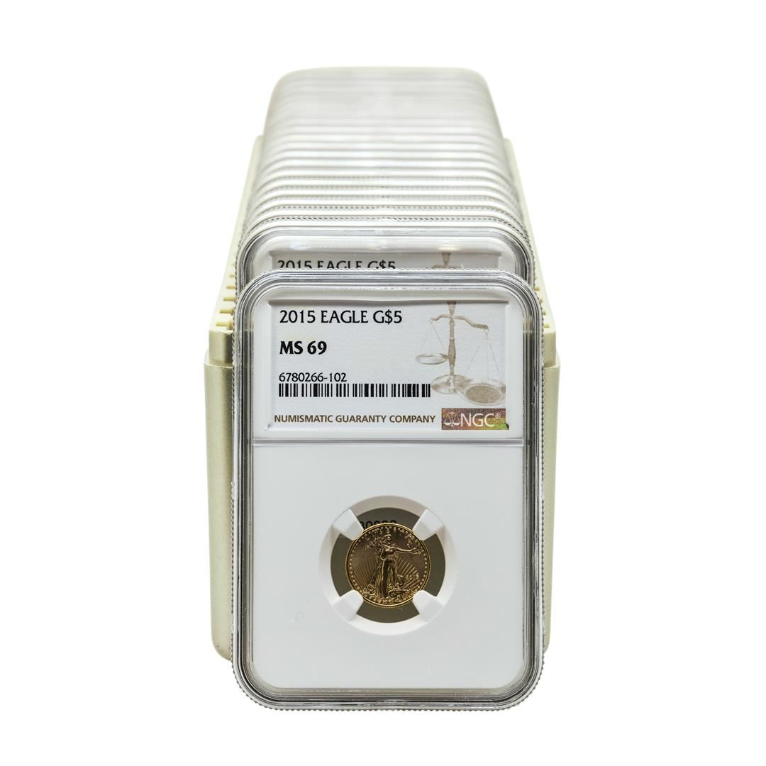One Lot of (10) 2015 & (10) 2016 $5 American Gold Eagle Coins NGC MS69. NGC Certified.
