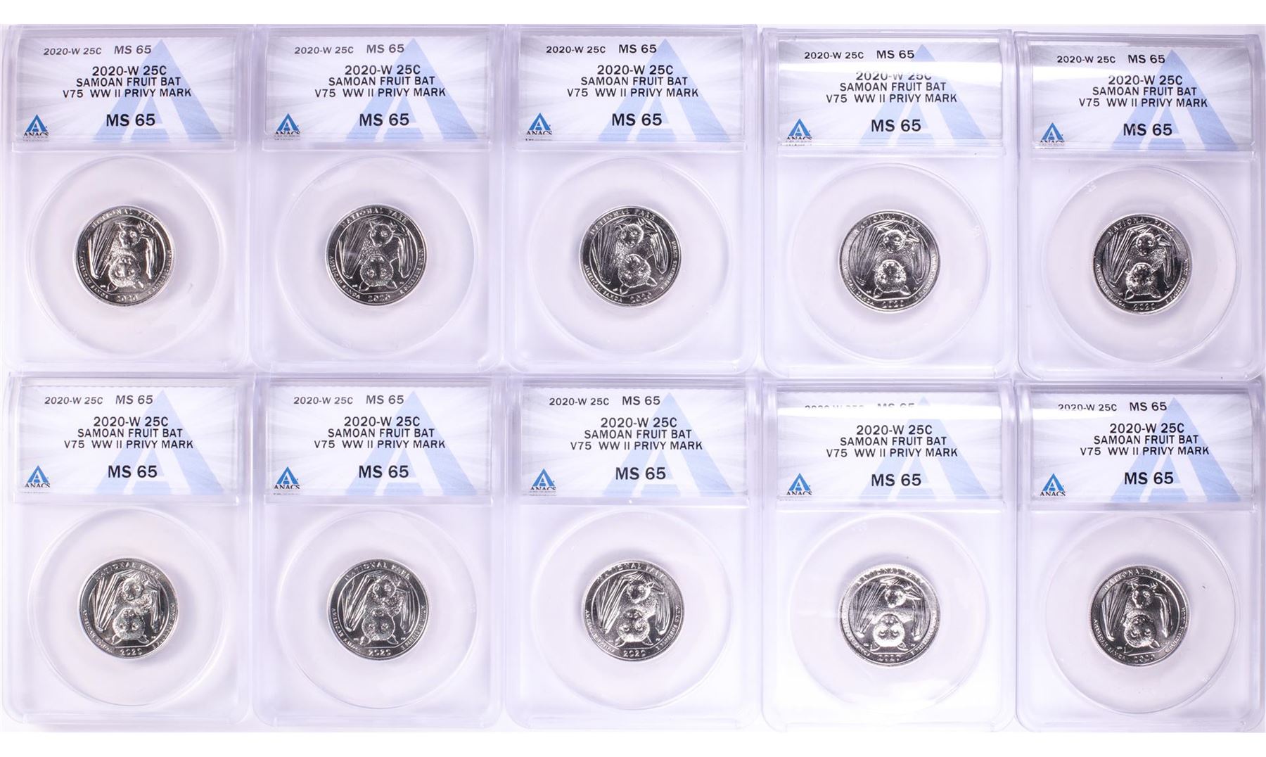 Lot of (10) 2020-W American Samoan Fruit Bat V75 WWII Quarters ANACS MS65