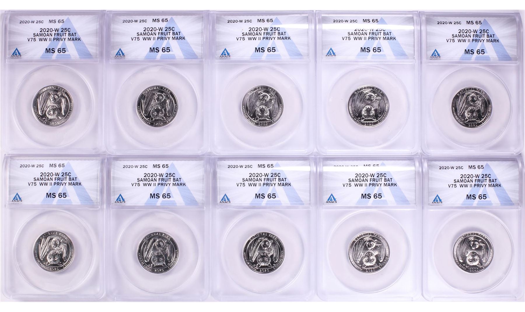 Lot of (10) 2020-W American Samoan Fruit Bat V75 WWII Quarters ANACS MS65