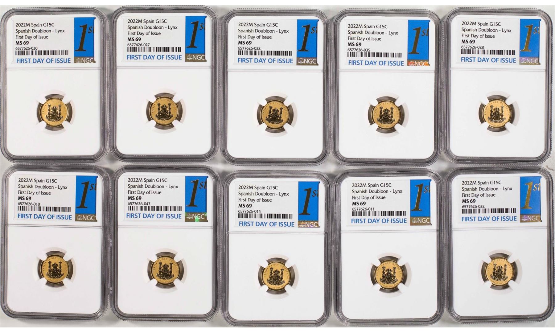 One Lot of (10) 2022M Spain 15 Euro Cent Lynx Gold Doubloon Coins NGC MS69 FDOI. NGC Certified.