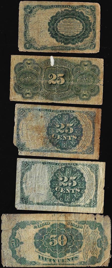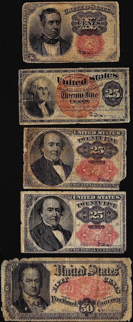 One Lot of 10/25/25/25/50 Cent Fractional Currency Notes.