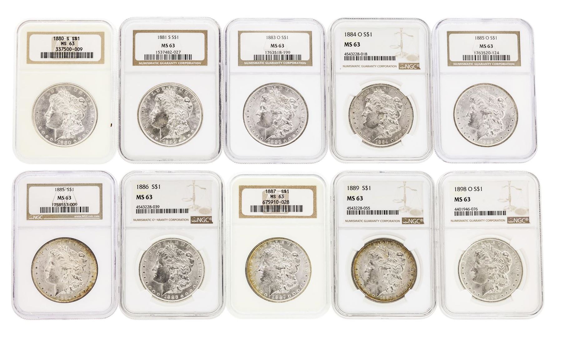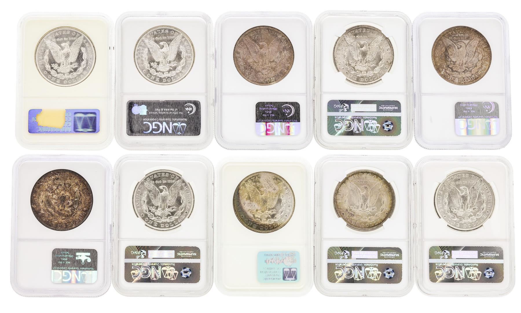 One Lot of (10) Assorted $1 Morgan Silver Dollar Coins NGC MS63. NGC Certified.