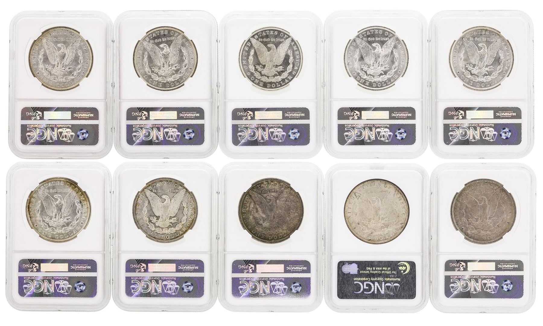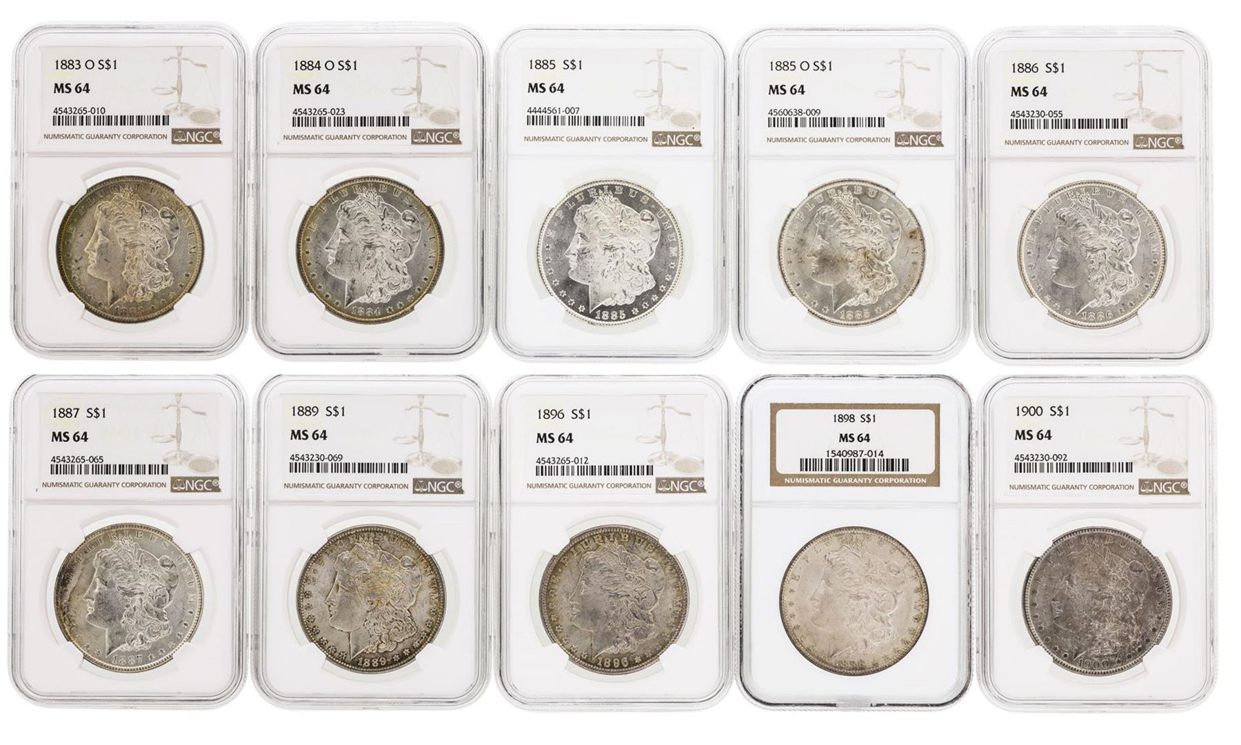 One Lot of (10) Assorted $1 Morgan Silver Dollar Coins NGC MS64. NGC Certified.