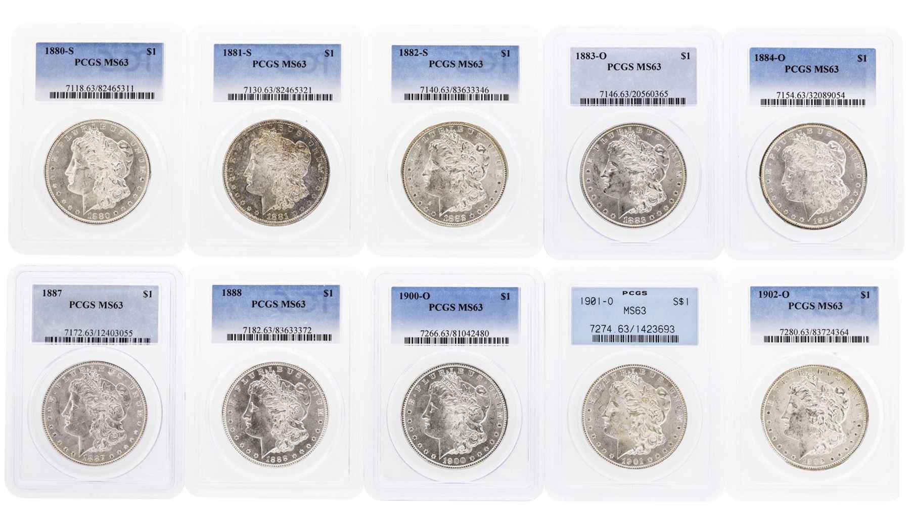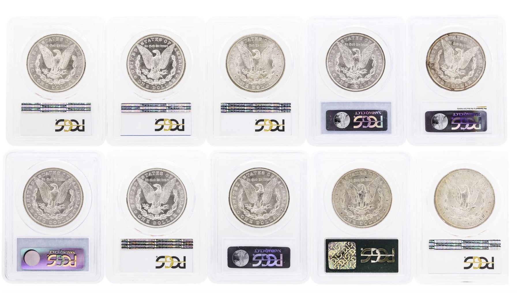 One Lot of (10) Assorted $1 Morgan Silver Dollar Coins PCGS MS63. PCGS Graded.