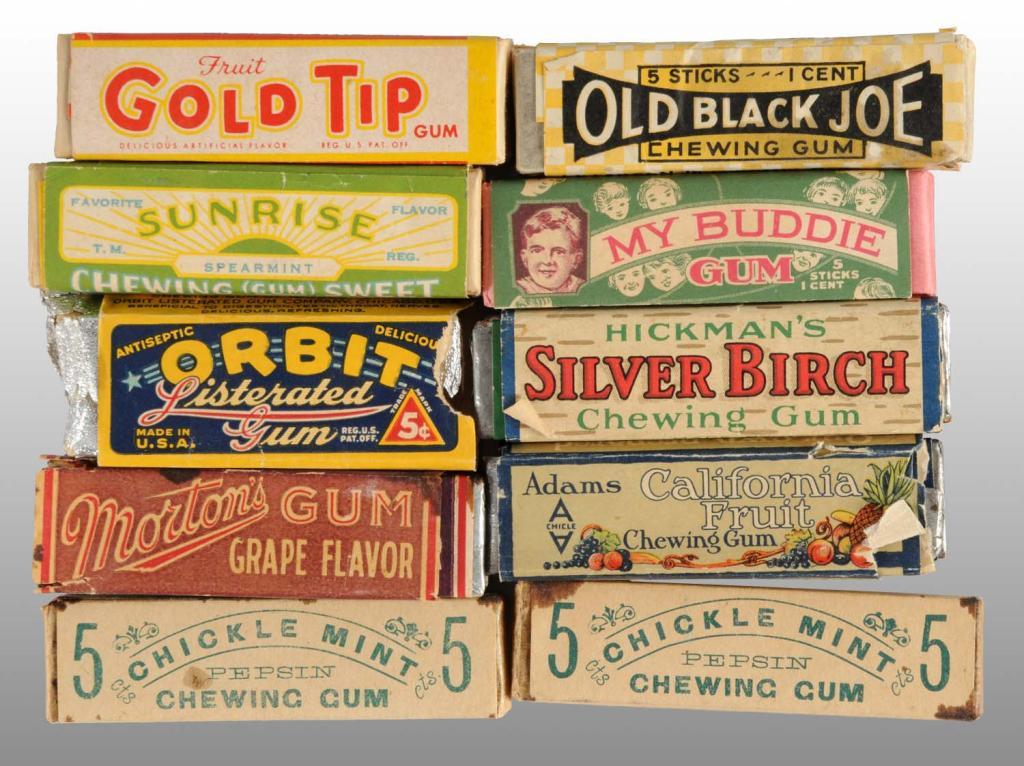 Description Includes Fruit Gold Tip Gum, Old Black Joe Chewing Gum, My Buddie Gum, Sunrise Spearmint, Orbit Listerated Gum, Silver Birch Chewing Gum, Morton's Gum, Adam's California Fruit Chewing Gum, and two Chickle Mint Pepsin Chewing Gum. Some leeching, tearing, and staining throughout with overall wear. Condition (Good - Excellent). Size All: 2 - 7/8" x 3/4".