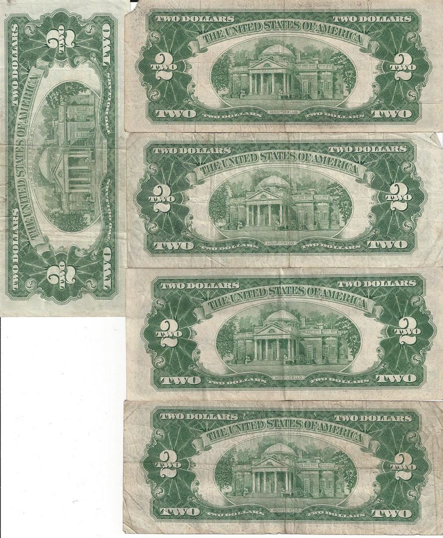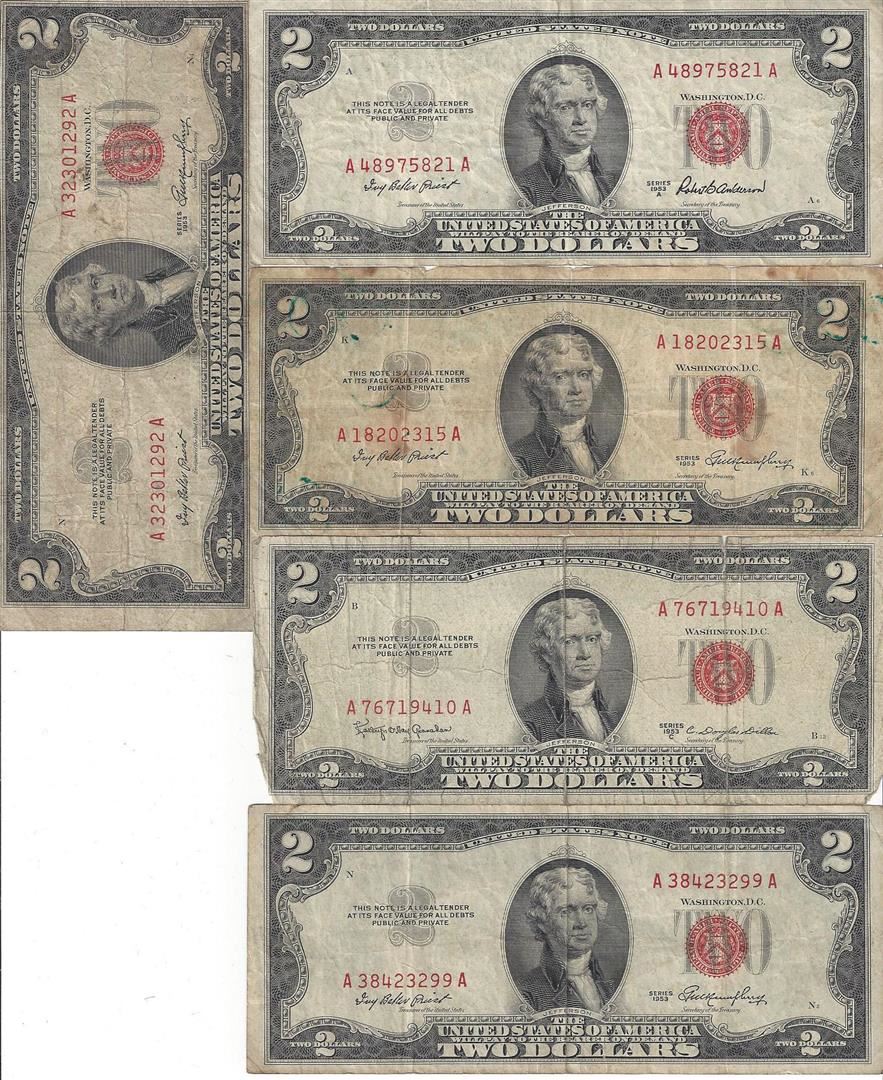 One Lot of 10 Assorted United States Red Seal $2 Bills. The images represent the lot of 10.