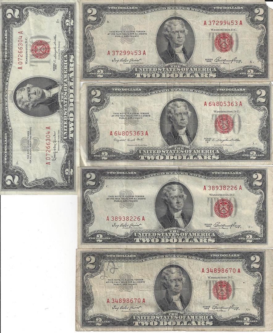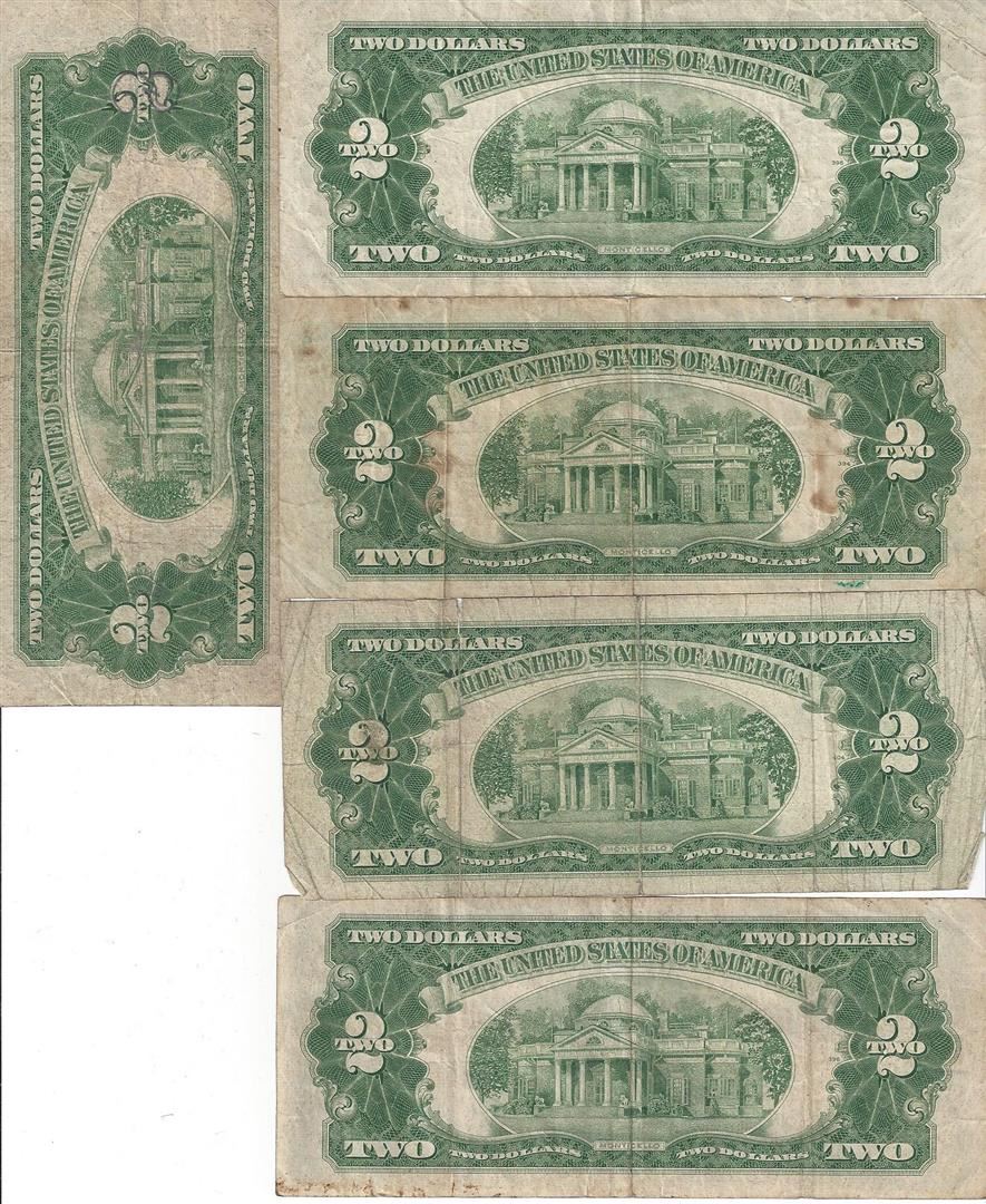 One Lot of 10 Assorted United States Red Seal $2 Bills. The images represent the lot of 10.