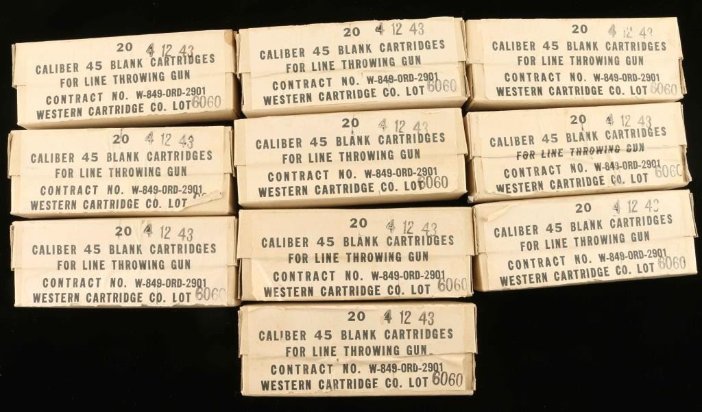 for line throwing gun. 4-12-43 WWII Era.Contract W-849-ORD-2901 Lot 6060. All unopened and near fine. Significantly improves the value of 45-70 Cal line throwing guns to have cartridges especially if military issue.