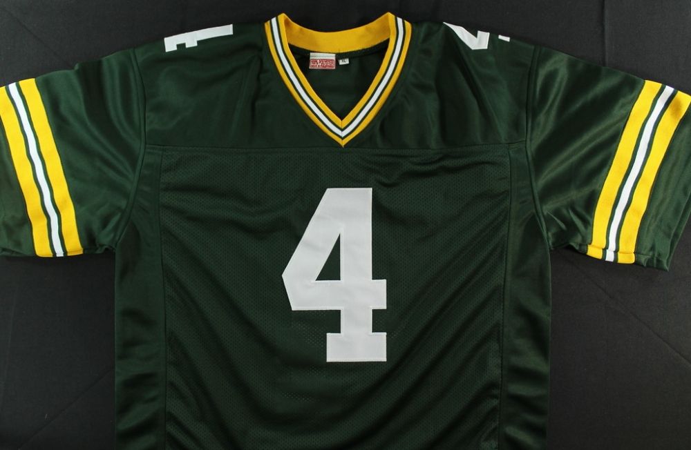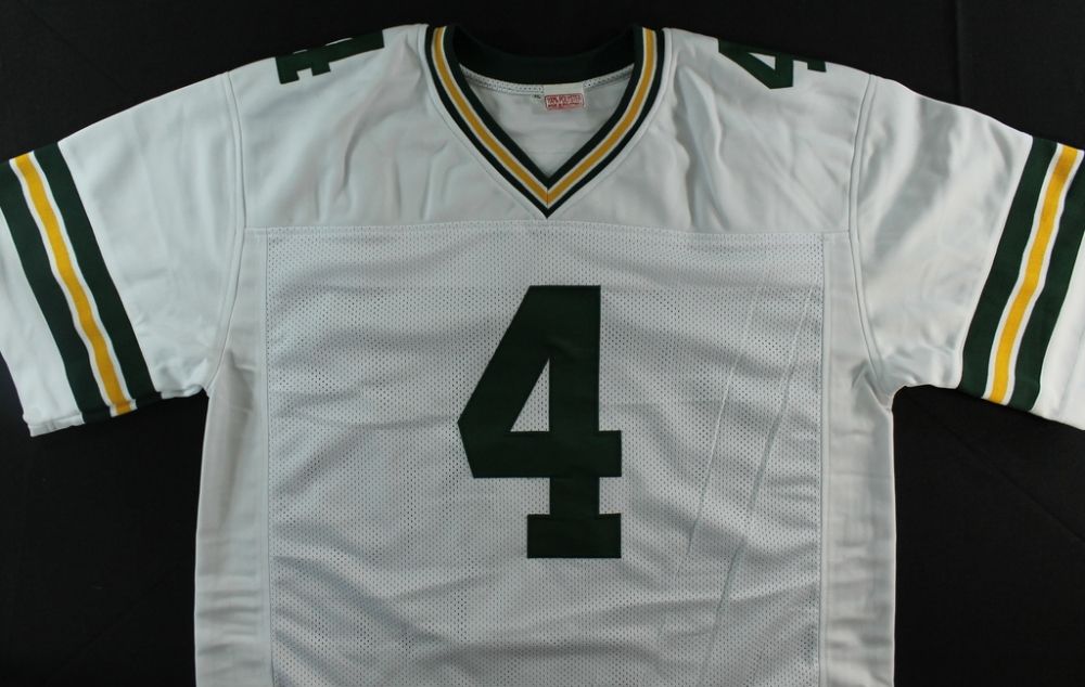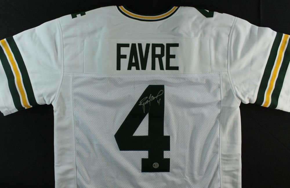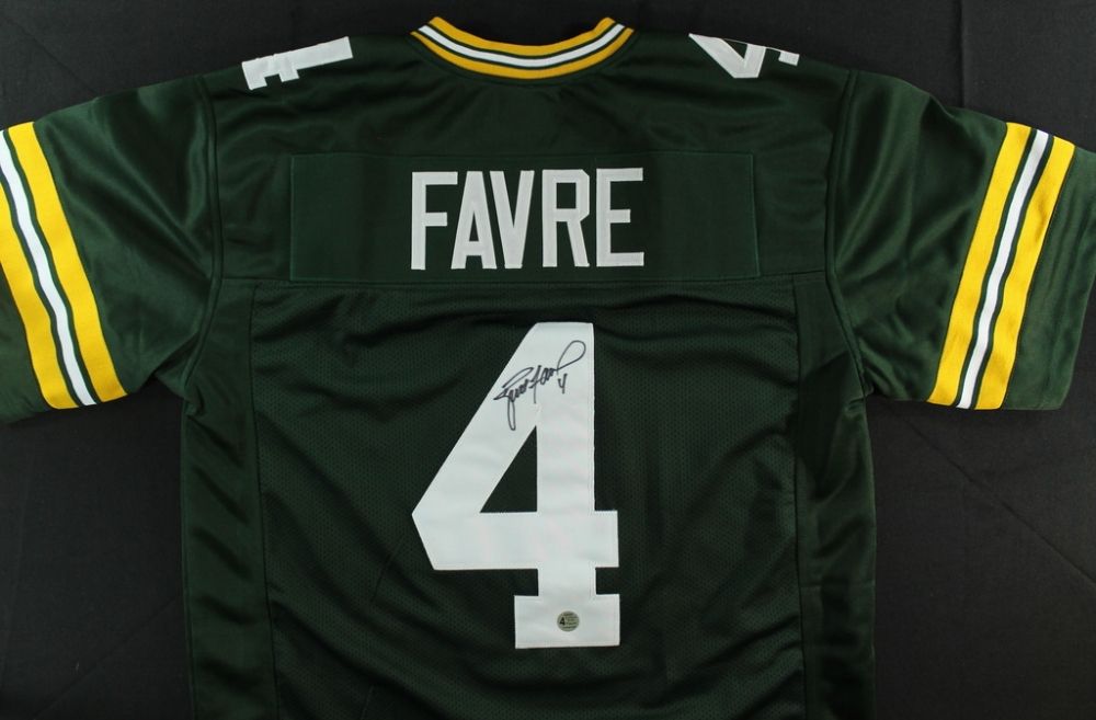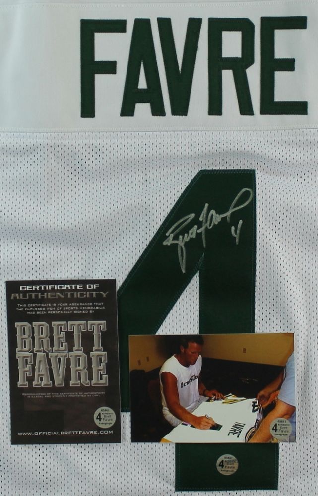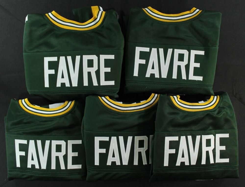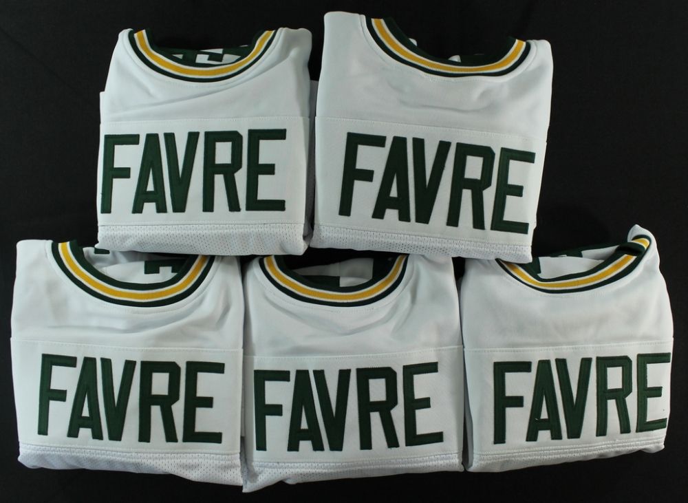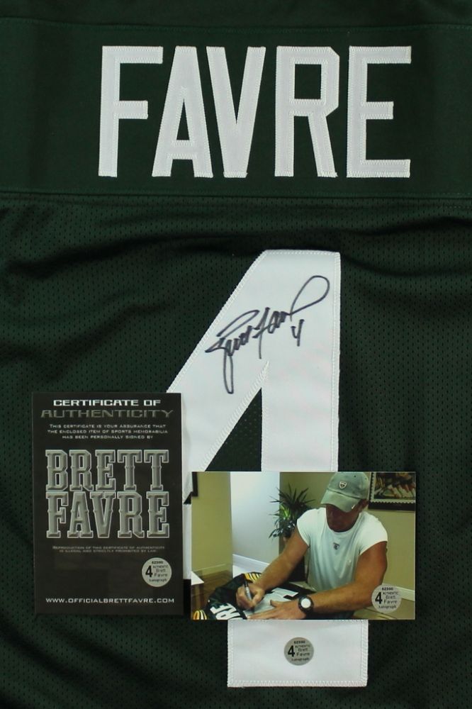 Lot of (10) custom on-field style jersey, size XL. Each one hand-signed in black felt-tip pen by Brett Favre (Packers). The autograph includes an official Brett Favre hologram and matching COA for authenticity purposes. Also includes a photo of Favre signing.