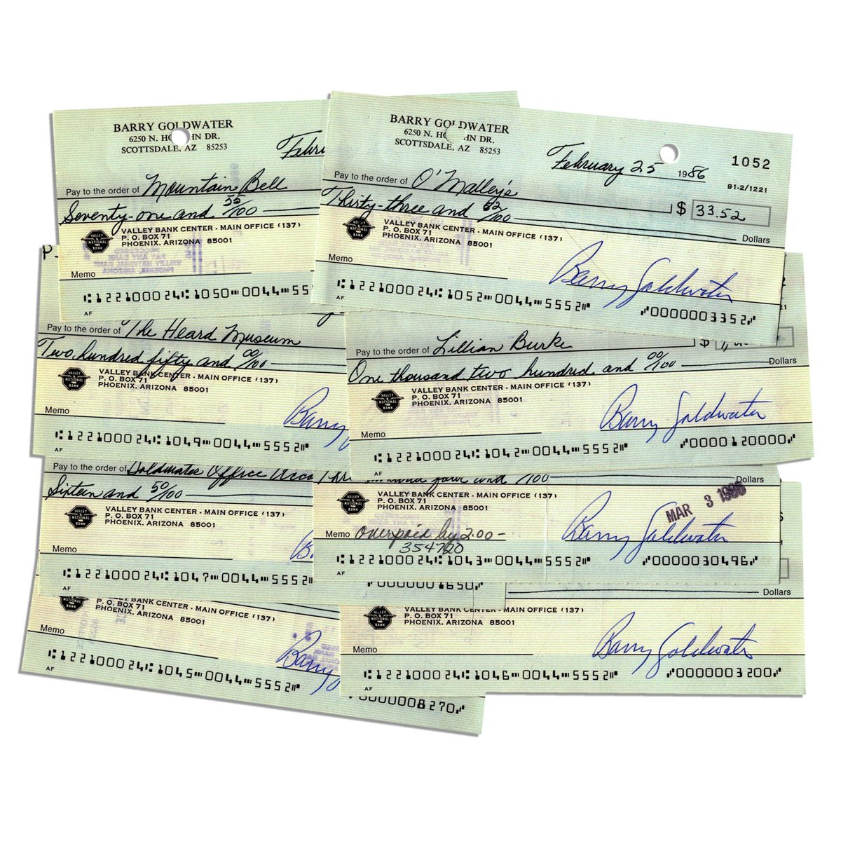 Lot of ten checks signed by Barry Goldwater, the father of the modern conservative movement which ushered Ronald Reagan into high office. The 6'' x 2.75'' checks are all dated 25 February 1986, drawn on the Valley National Bank of Phoenix and bear Goldwater's Scottsdale home address at top. Punch and staple holes, else near fine.