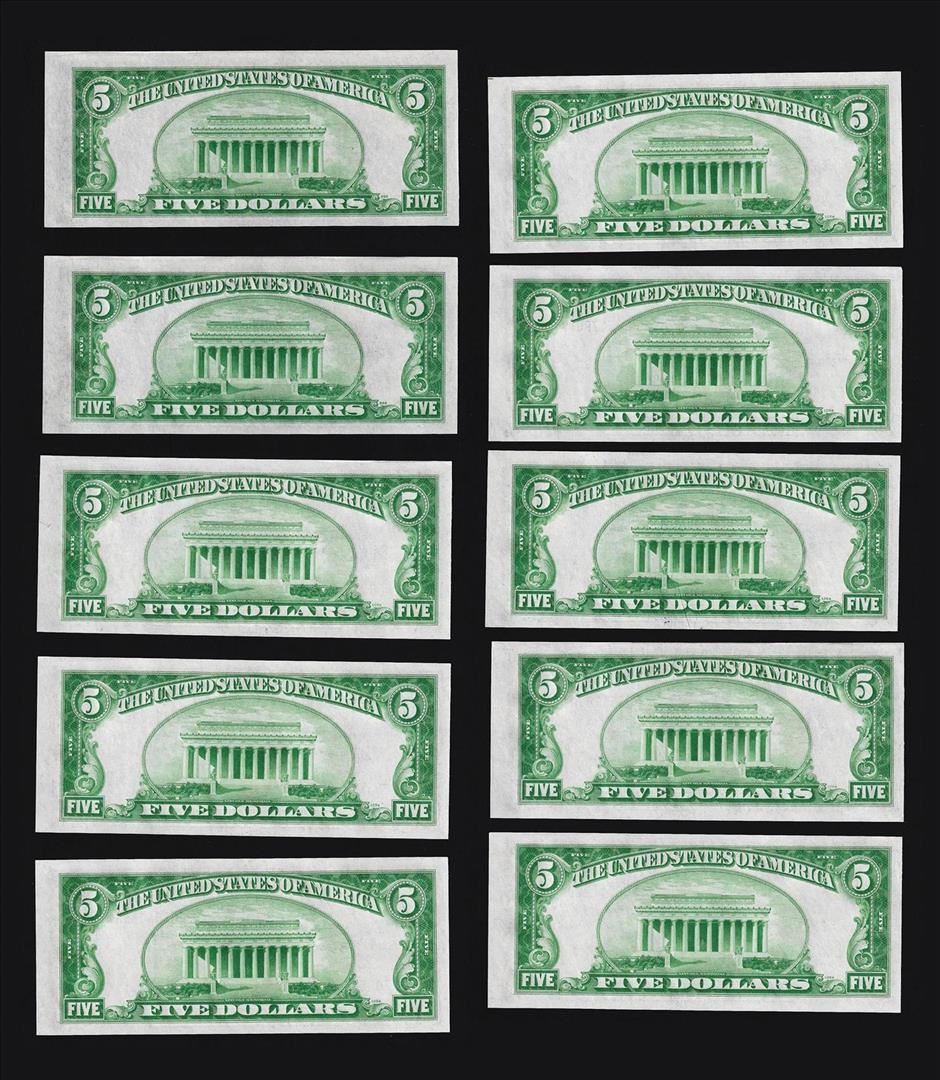 One Lot of (10) Consecutive 1928C $5 Red Seal Legal Tender Notes.