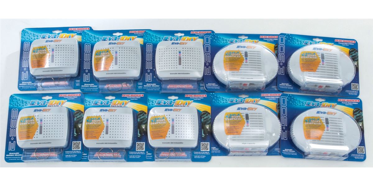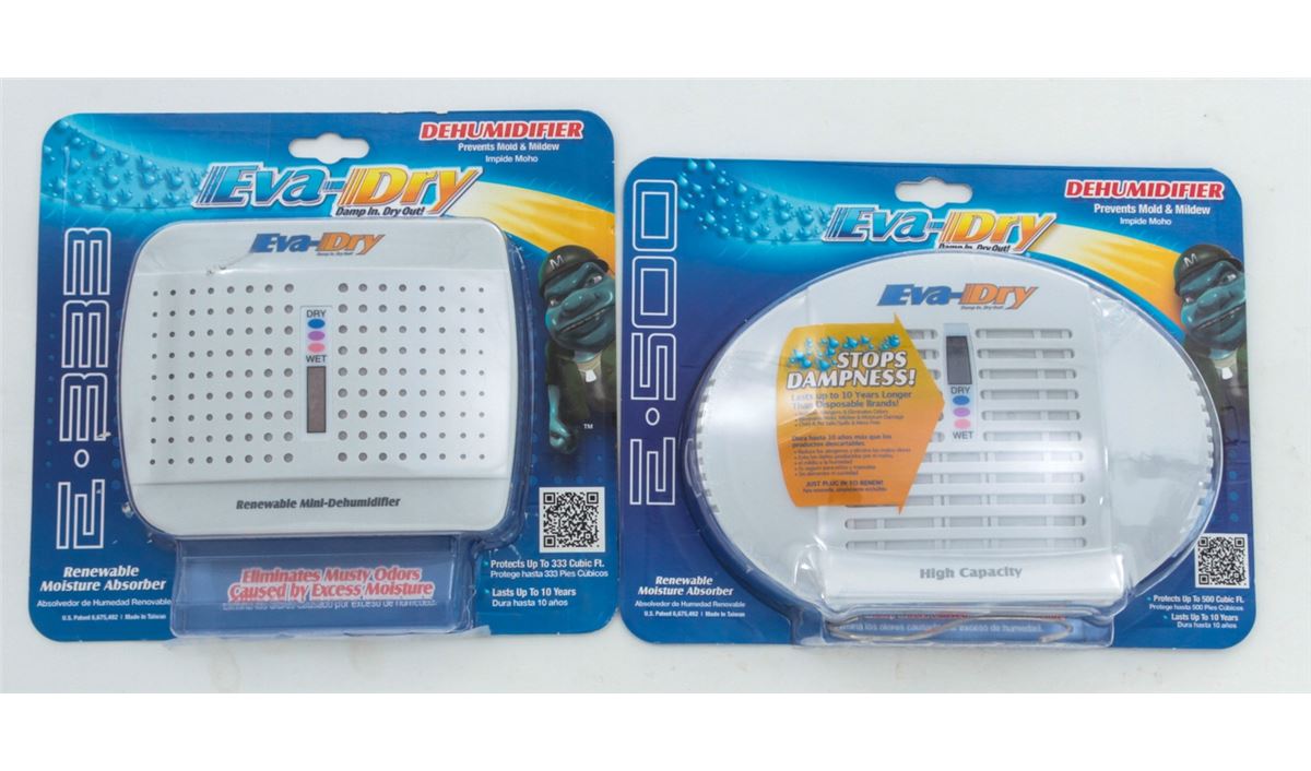 Lot of Ten (10) Eva-Dry Dehumidifiers, protects up to 333 cubic feet. Brand new in original packaging. Retails @ approx. $250/lot. Est.: $100-$200/lot. (Field Time)