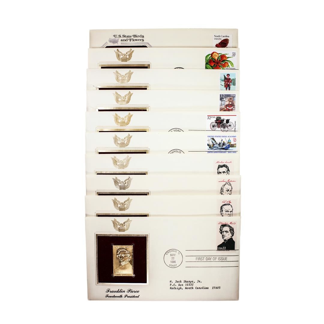 Lot of (10) First Day Of Issue 22KT Gold Replica Stamps in Envelopes