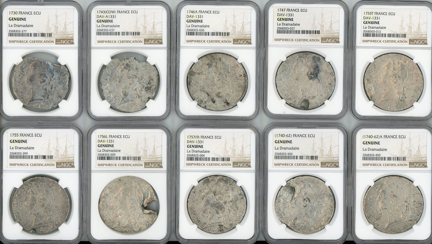 Lot of 10 French (various mints) ecus, Louis XV (large bust), various dates (nearly all visible) in the range of 1740-62, all NGC genuine / La Dramadaire. Dav-1331. All moderately to heavily corroded, some with damage, yet all with some clear details in addition to dates and/or mintmarks. Recovered from: Le Dromadaire, sunk in 1762 off the Cape Verde Islands, west of Africa