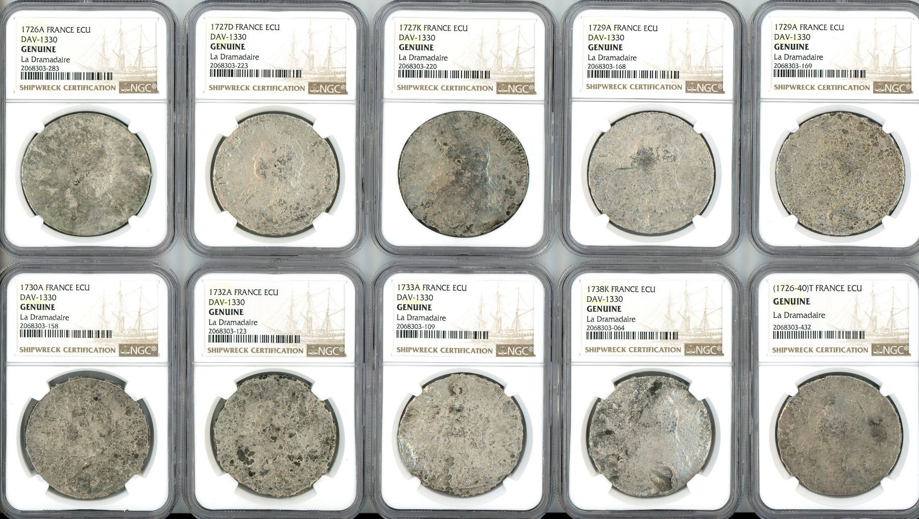 Lot of 10 French (various mints) ecus, Louis XV (small bust), various dates (all visible) in the range of 1726-40, all NGC genuine / La Dramadaire. Dav-1330. All moderately to heavily corroded, some with damage, yet all with some clear details in addition to dates and/or mintmarks. Recovered from: Le Dromadaire, sunk in 1762 off the Cape Verde Islands, west of Africa
