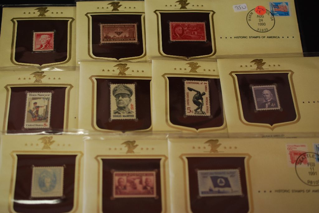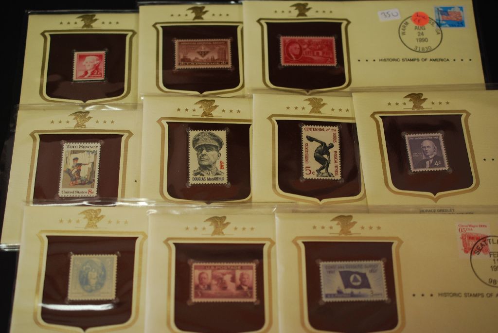 Lot of 10 Historic Stamps of America; 1937 Virginia Dare 5c, 1939 Panama Canal 3c, 1945 F.D.R. 2c, 1