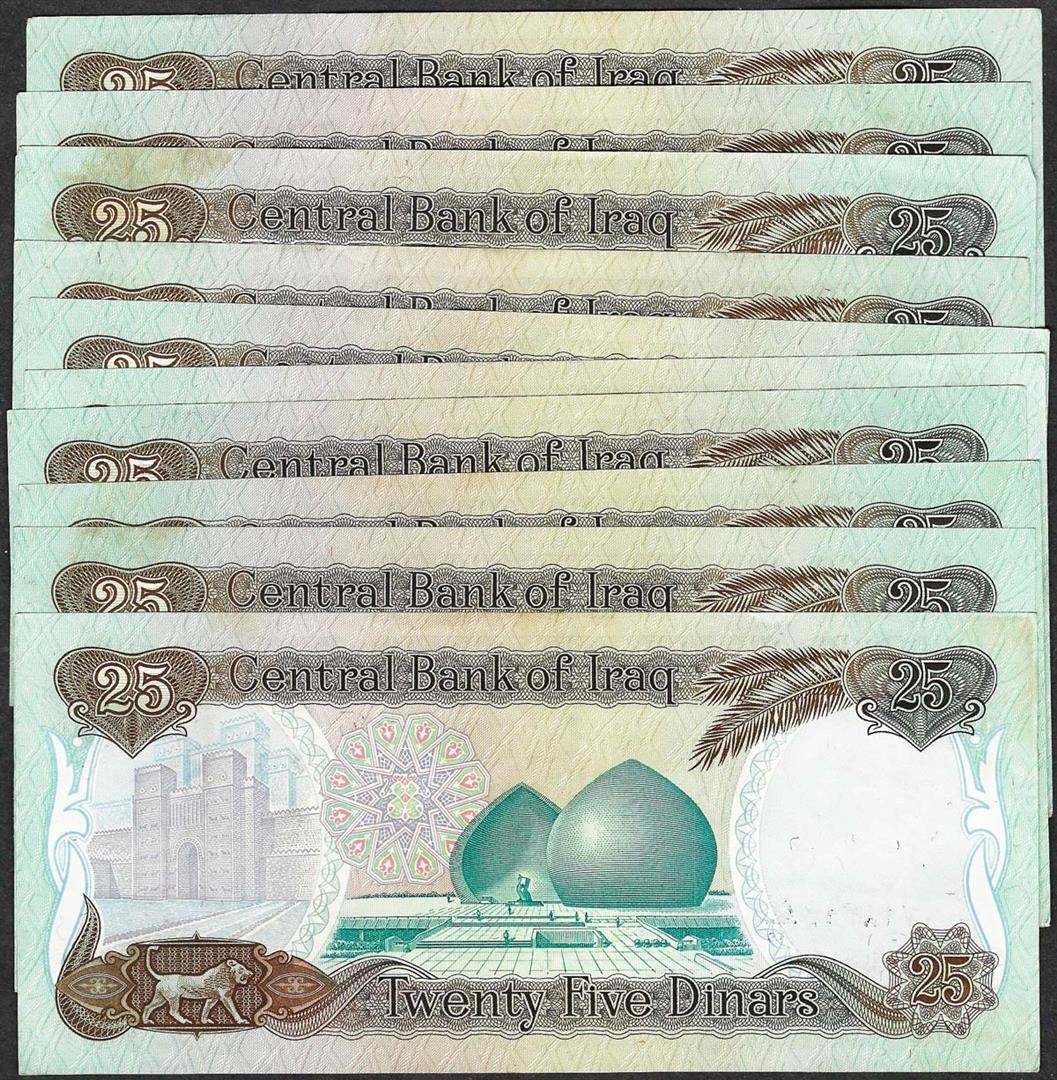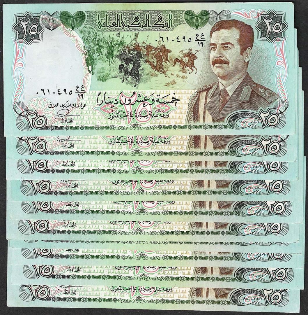 One Lot of (10) Iraqi 25 Dinars Saddam Hussein Notes.