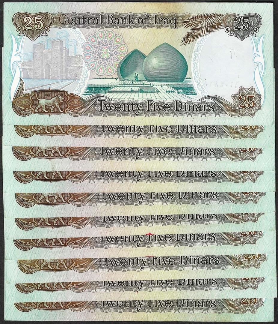 One Lot of (10) Iraqi 25 Dinars Saddam Hussein Notes.