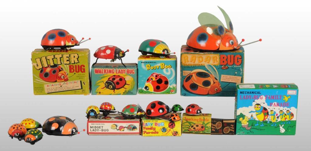 Description Japanese. Working. Three of the toys are made by T.P.S. Includes colorful original boxes, some with creases and tears. Condition (Excellent). Size Largest: 6" L.