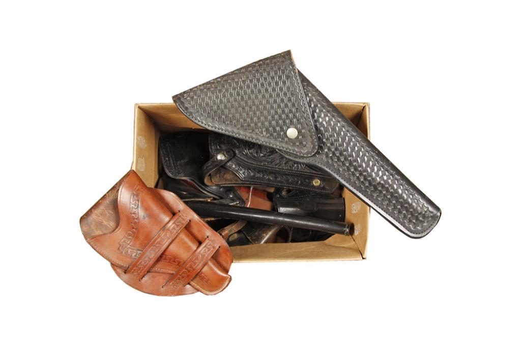 Lot of 10 Leather Holsters Mixed lot of leather holster, mostly maker marked. 2 paddle holsters, 2 large black flap holsters for large single actions, a nicely tooled clip model, and 5 more.Mixed lot of leather holster, mostly maker marked. 2 paddle holsters, 2 large black flap holsters for large single actions, a nicely tooled clip model, and 5 more.
