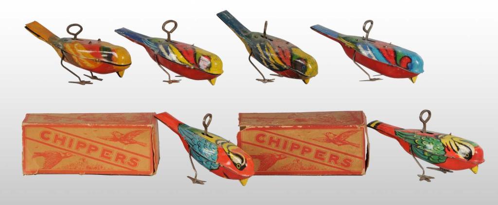 Description American. Circa 1920s. Includes same bird in ten different colors of lithography. Minor overall wear to birds. Includes two original partial boxes with the word "Chippers" across them. Not all pictured. Condition (Excellent). Size All birds: 5" L.