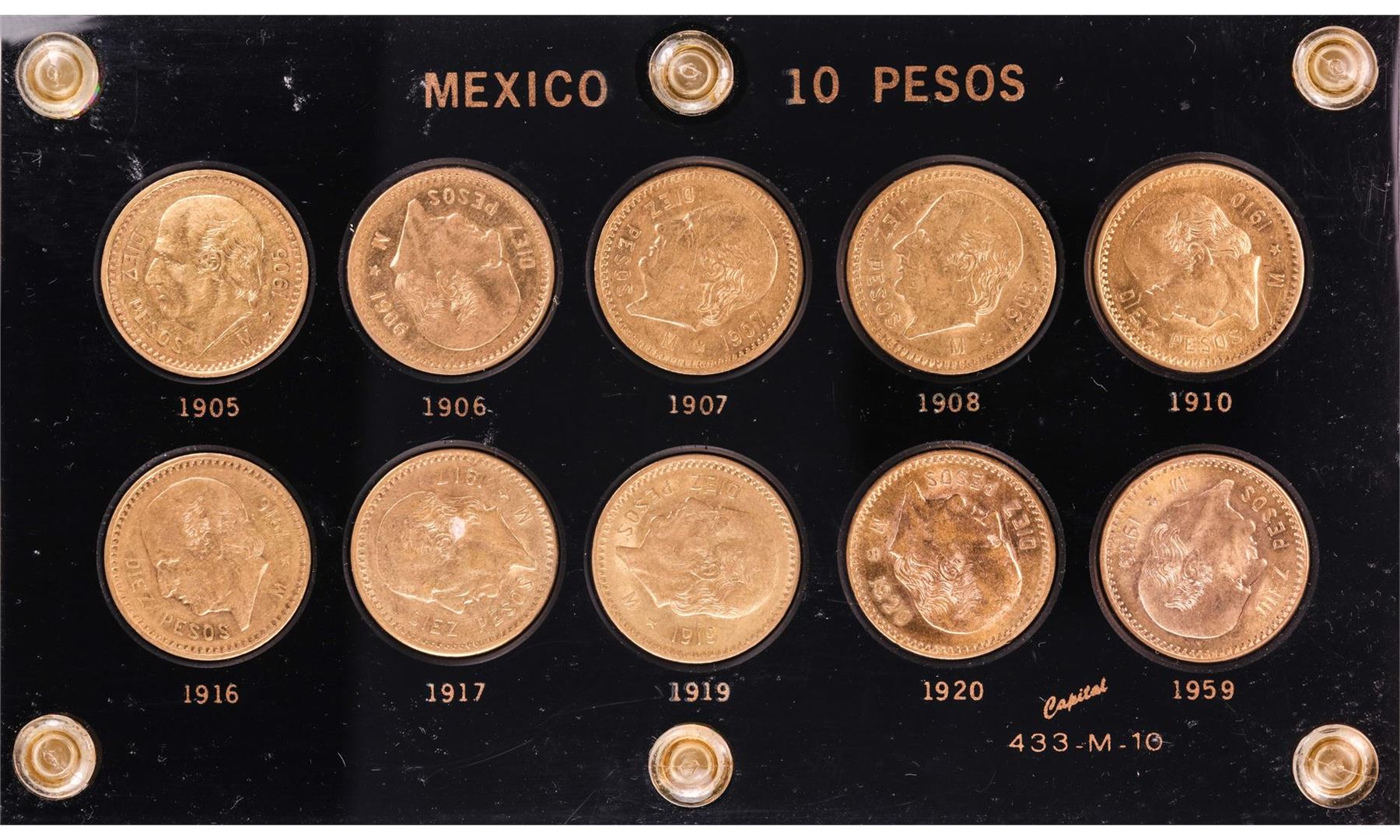 One Lot of (10) Mexico 10 Pesos Gold Coins in Capitol Plastic.