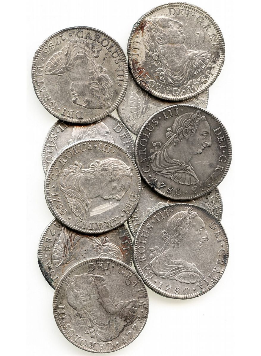 Lot of 10 Mexico City, Mexico, bust 8 reales of Charles III, various dates: 1774FM, 1778FF, 1780FF (