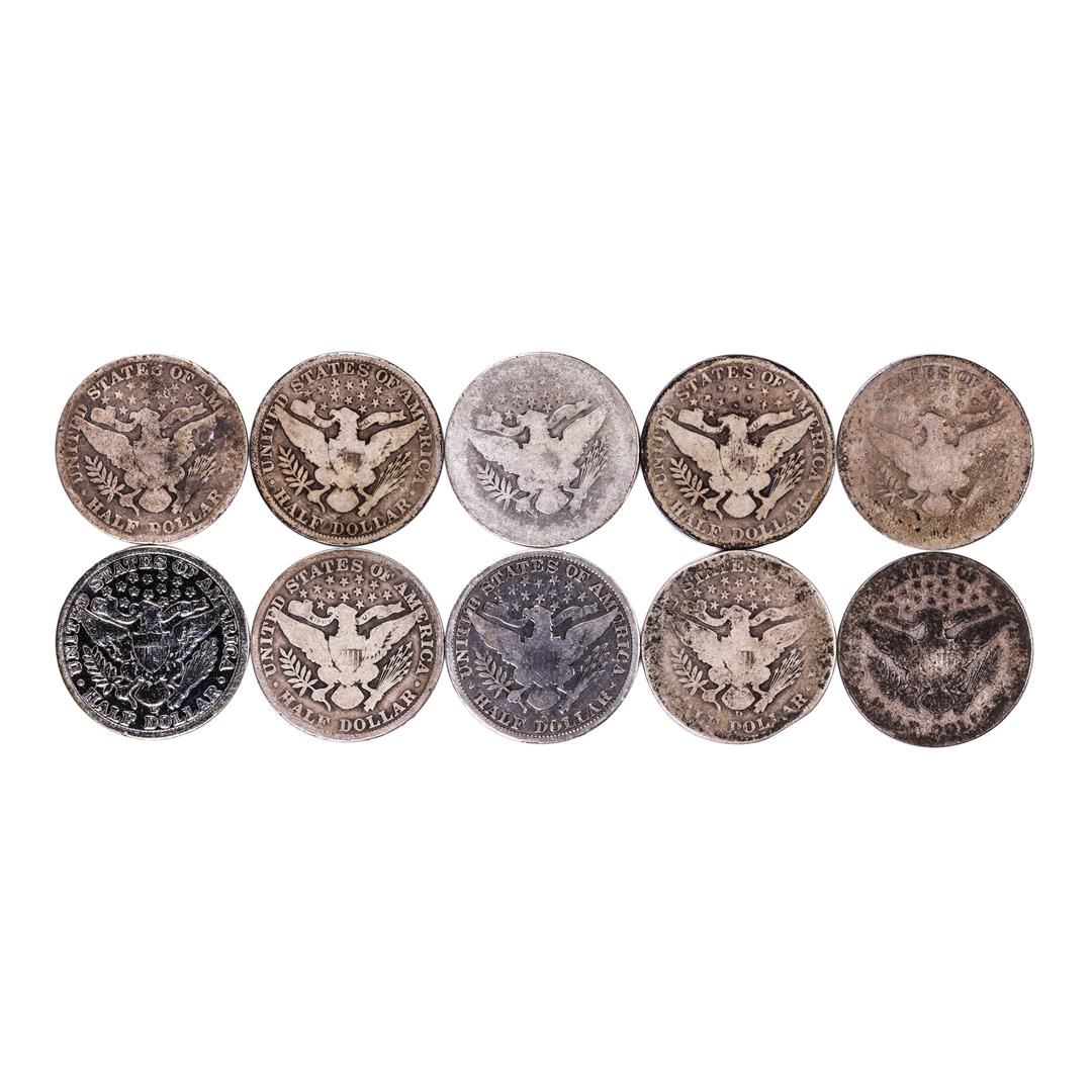One Lot of (10) Mixed Date Barber Half Dollar Coins.