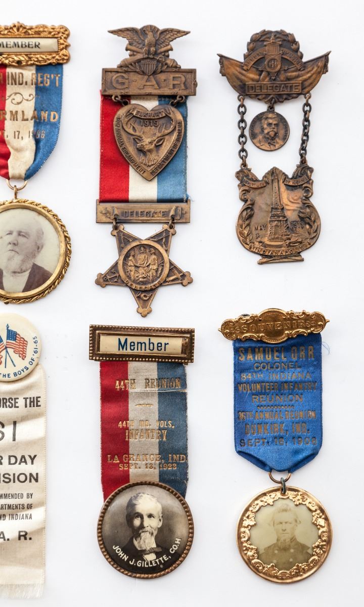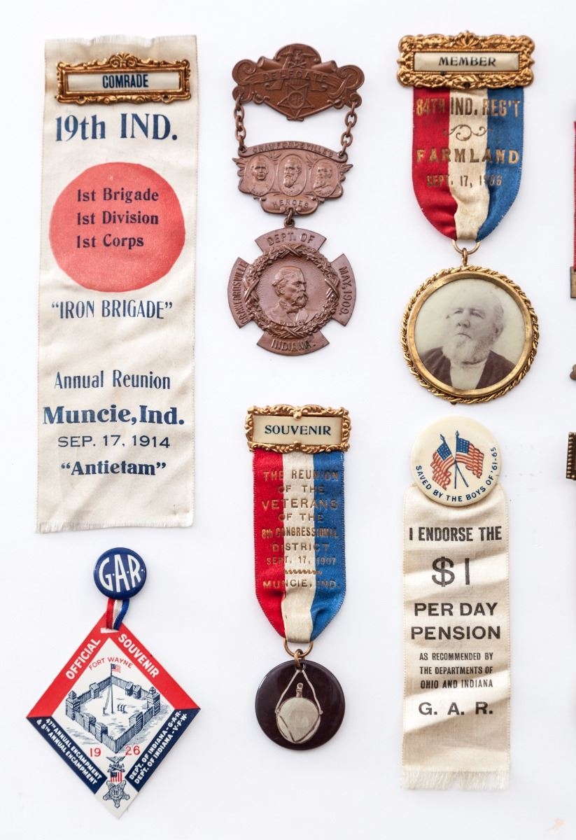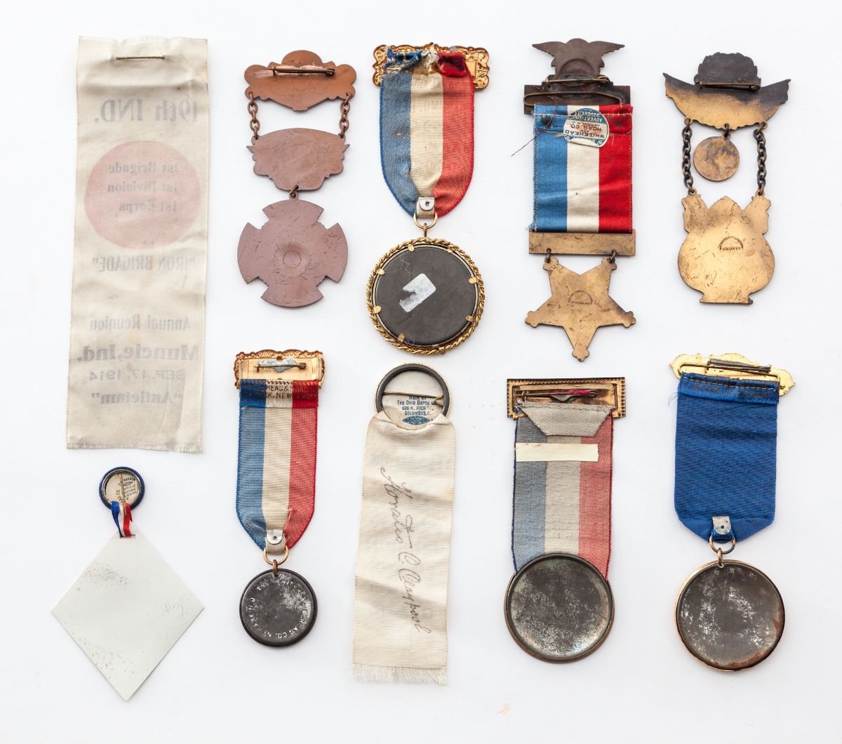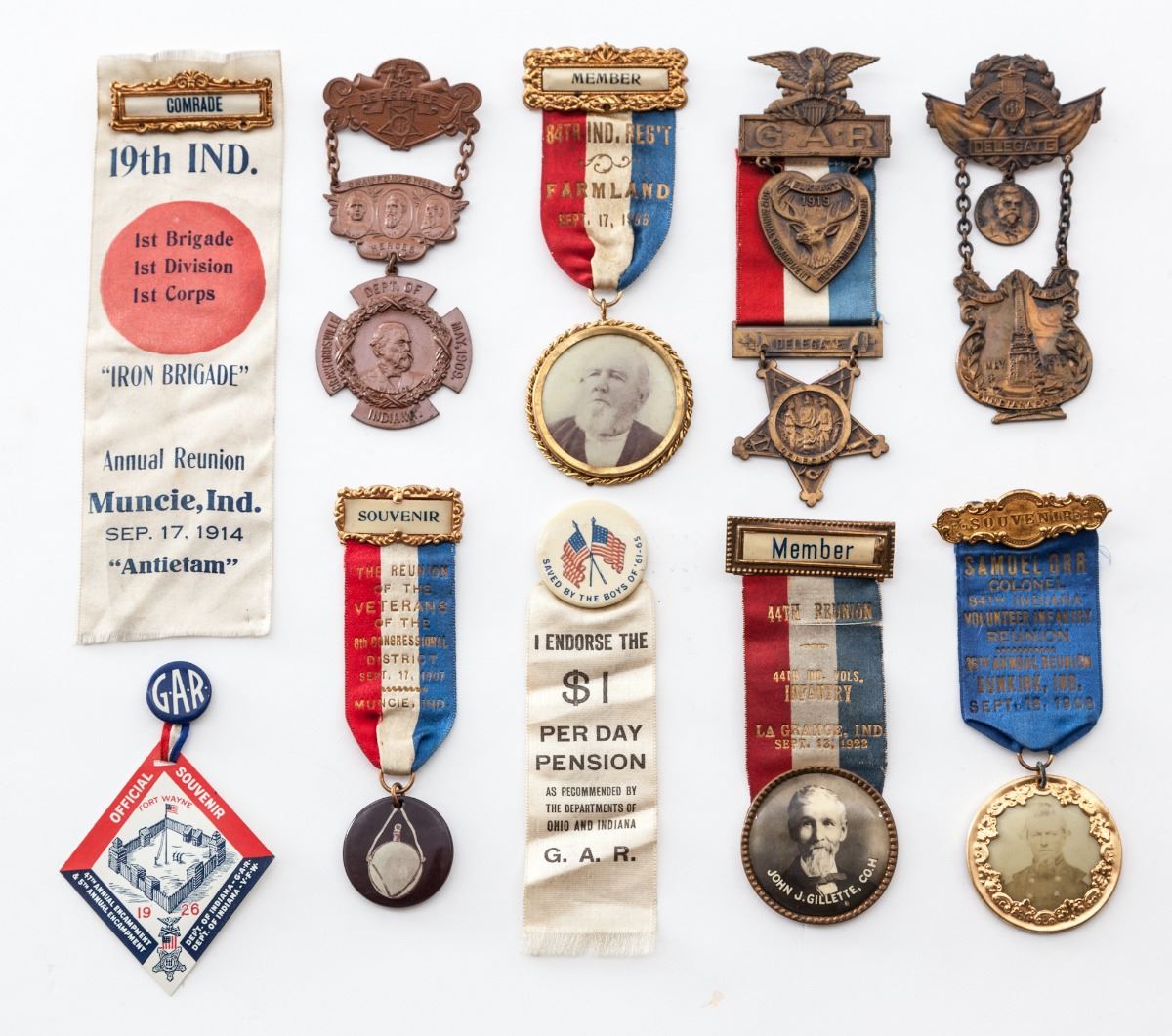 Lot of Ten (10) Pieces of Indiana State GAR Memorabilia: (1) 1908 dated, Dunkirk, Ind. 84th Vol. Infantry souvenir badge. (2) 1907 dated, Muncie, Ind. 8th Cognressional District Reunion of the Veterans souvenir badge. (3) 1926 dated, Fort Wayne, Ind. souvenir Encampment badge. (4) 1906 dated, Farmland, Ind. 84th Ind. Reg't Member Reunion badge. (5) 1923 dated, LaGrange, Ind. 44th Ind. Vols. Infantry Member Reunion badge. (6) Ohio & Indiana $1 Per Day Pension badge. (7) 1909 dated, Crawfordsville, Ind. Delegate badge, with suspension bar and two drops, one depicting Crawfordsville heroes. (8) 1913 dated, Indianapolis, Ind. Delegate Encampment badge, with suspension bar and two drops. Mfg'd by Whitehead & Hoag. (9) 1919 dated, Elkhart, Ind. Delegate Encampment badge, with suspension bar, two drops, red/white/blue ribbon, and Whitehead & Hoag maker's label attached to back side of ribbon, as well as maker's marks to both drops. (10) 1914 dated, Muncie, Ind. 19th Ind. ''Iron Brigade'' ribbon with Comrade bar. Condition to all is about fine. Ribbons show light to moderate age and wear. Medal surfaces with general toning, as well as some darkening to two of the delegate badges. Est.: $250-$500/lot.