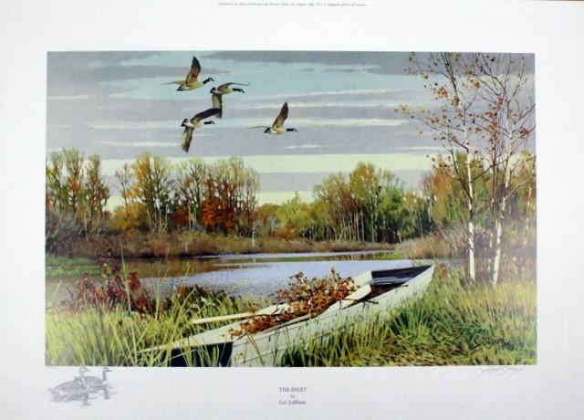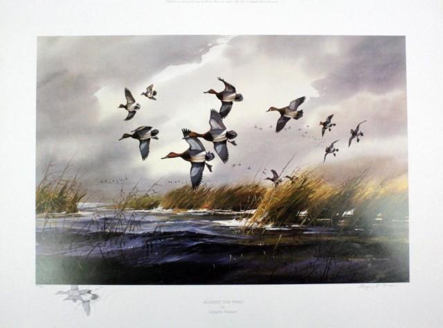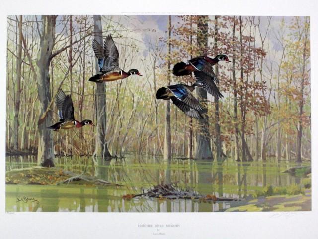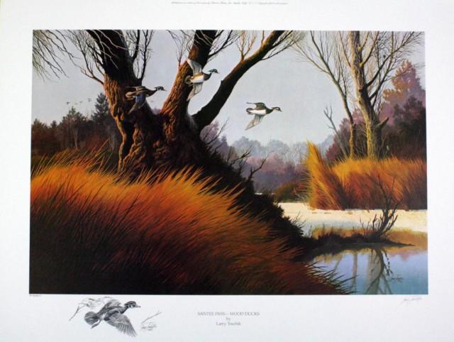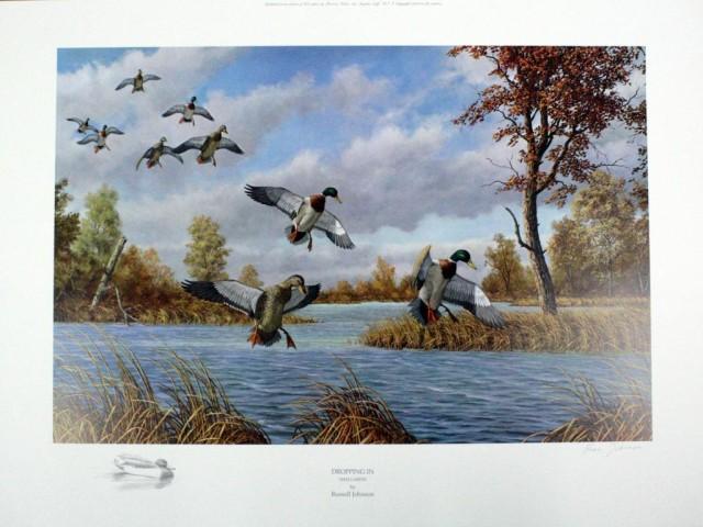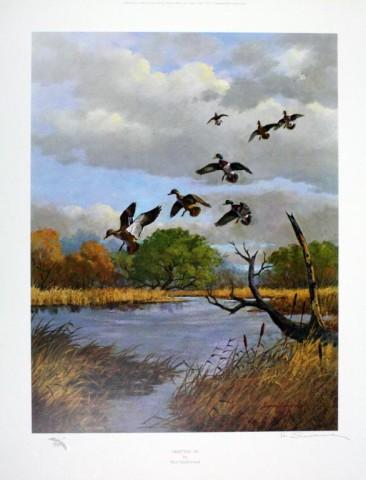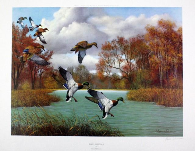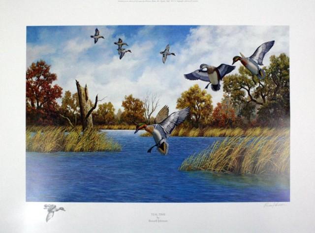 Lot of 10 Prints all numbered and signed: “Teal Time” by Russell Johnson, image size 24” x 16”., “Called-In” (Canada Geese) by Larry Toschik, image size 24 ¾” x 17”., “Hatchee River Memory” by Lee LeBlanc, image size 24 ¾” x 16”., “Early Arrivals by Russell Johnson, image size 24” x 18”., “Santee-Pass-Wood Ducks” by Larry Toschik, image size 24” x 16”., “Drifting In” by Ken Smallwood, image size 17 ½” x 23”., “The Low Flyers” by Larry Barton, image size 23 ¾” x 16”., “Against The Wind” by Gregory Messier, image size 24” x 16”., “The Inlet” by Lee LeBlanc, image size 24” x 15 ½”., “Dropping In” (Mallards) by Russell Johnson, image size 24” x 16”. Gallery Retail $395. each. Est. $500-1,000
