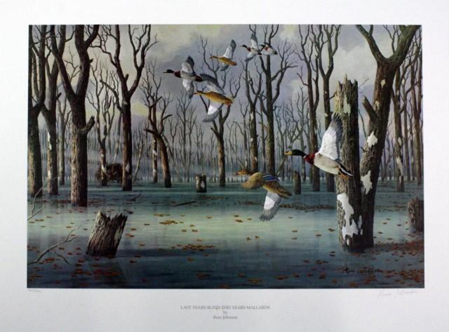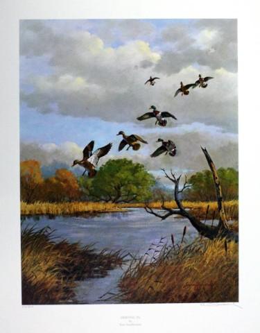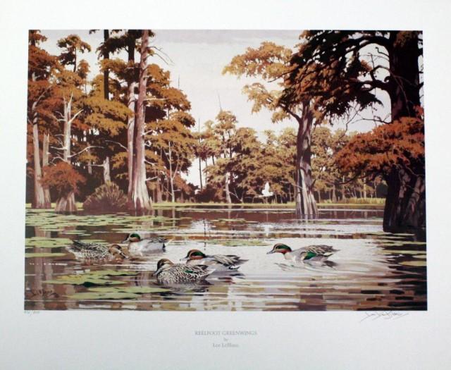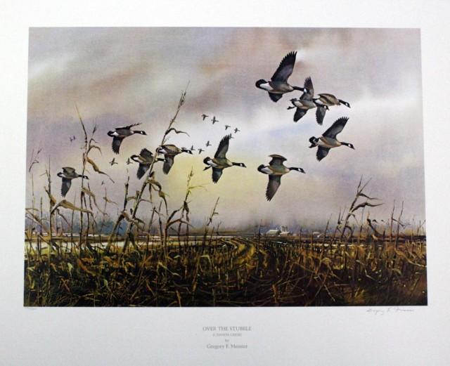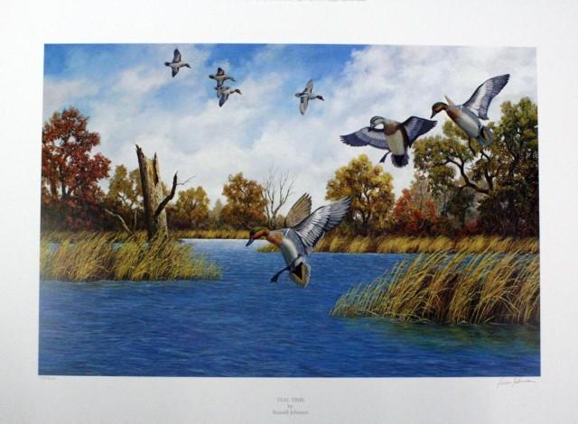 Lot of 10 Prints all numbered and signed. Tranquility" by Larry Barton image size 16" x 18 1/2". "Midnite Prince" by Graeme Stevenson image size 17" x 24". "Over the Stubble" (Canada Geese) by Gregory F. Messier image size 20 1/2" x" 14 1/2. "Reelfoot Greenwings" by Lee LeBlanc image size 20 1/2" x 14 1/2". "Teal Time" by Russell Johnson image size 24" x 16". "The Low Flyers" by Larry Barton
