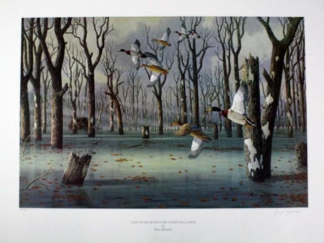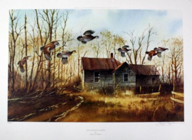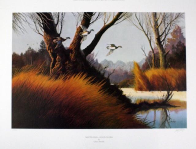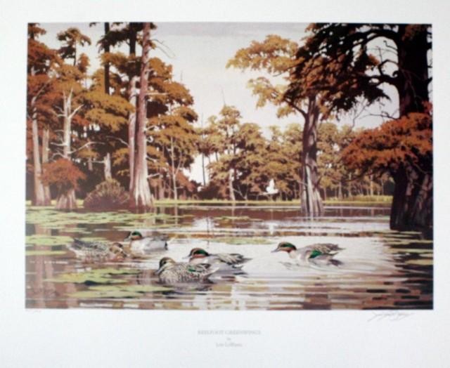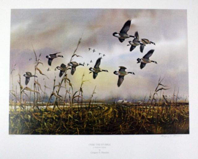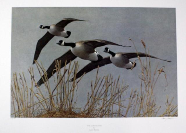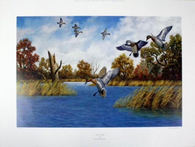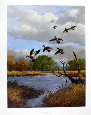 Lot of 10 Prints all numbered and signed: “Tranquility” by Larry Barton, image size 16” x 18 ½”., “Midnite Prince” by Graeme Stevenson, image size 17” x 24”., “Over the Stubble” (Canada Geese) by Gregory F. Messier, image size 20 ½” x 14 ½”., “Reelfoot Greenwings” by Lee LeBlanc, image size 20 ½” x 14 ½”., “Teal Time” by Russell Johnson, image size 24” x 16”., “The Low Flyers” by Larry Barton, image size 24” x 16”., “Santee Pass-Wood Ducks” by Larry Toschik, image size 24” x 16”., “Last Years Blind This Years Mallards” by Russ Johnson, image size 23 ¾” x 16”., “Drifting In” by Ken Smallwood, image size 17 ½” x 23”., “The Homesteaders” by James H. Killen., image size 24 ¾” x 16”. Gallery Retail $395. each. Est. $500-1,000