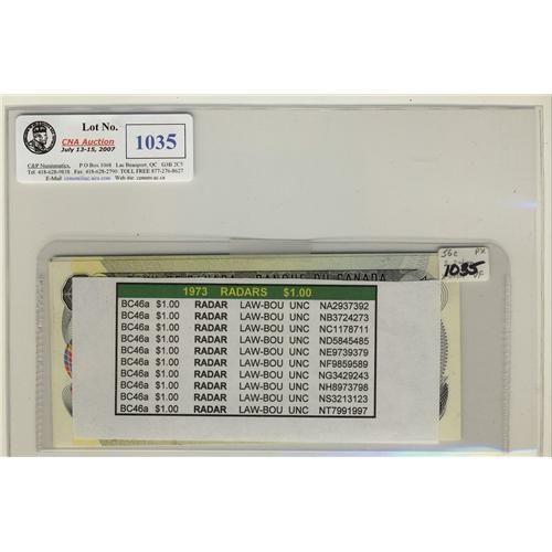 Lot of 10 "RADAR" notes. BC-46a 1973 $1 Lawson-Bouey,all DIFFERENT PREFIX notes. Includes NA2937392,NB3724273,NC1178711,ND5845485,NE9739379,NF9859589,NG3429243,NH8973798,NS3213123,NT991997. All notes are Choice Uncirculated.