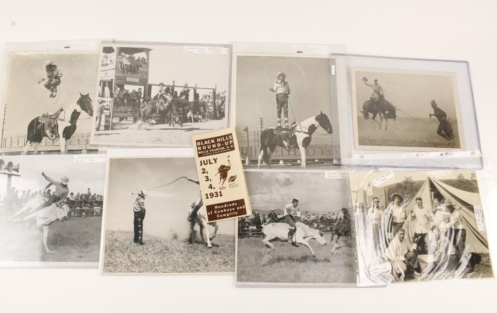 Lot of 10 Rodeo advertising photos (mostly 8” x 10” and 6-1/2” x 8-1/2”) and a collectible 1931 Black Hills Round-Up program. The photos include a number indentified to specific events and performers. Three photos are from the Saratoga, WY Rodeo of 1935 and show Bill Whitney and Tommy Trowbridge in action shots, two photos of cowboys on bucking broncos with news releases on back indicating the Wild West Rodeo Performers for a Madison Square Garden event in 1922, two signed photos of trick rider/roper Sylvester Braun, a signed photo of trick rider Ben Pitti (1951) and a great set of photos related to the Calgary Stampede of 1925 with news article about “Hoot” Gibson’s appearance including photos of cameraman Dave Brodie plus other members of Gibson’s crew. Est.: $75-$125.