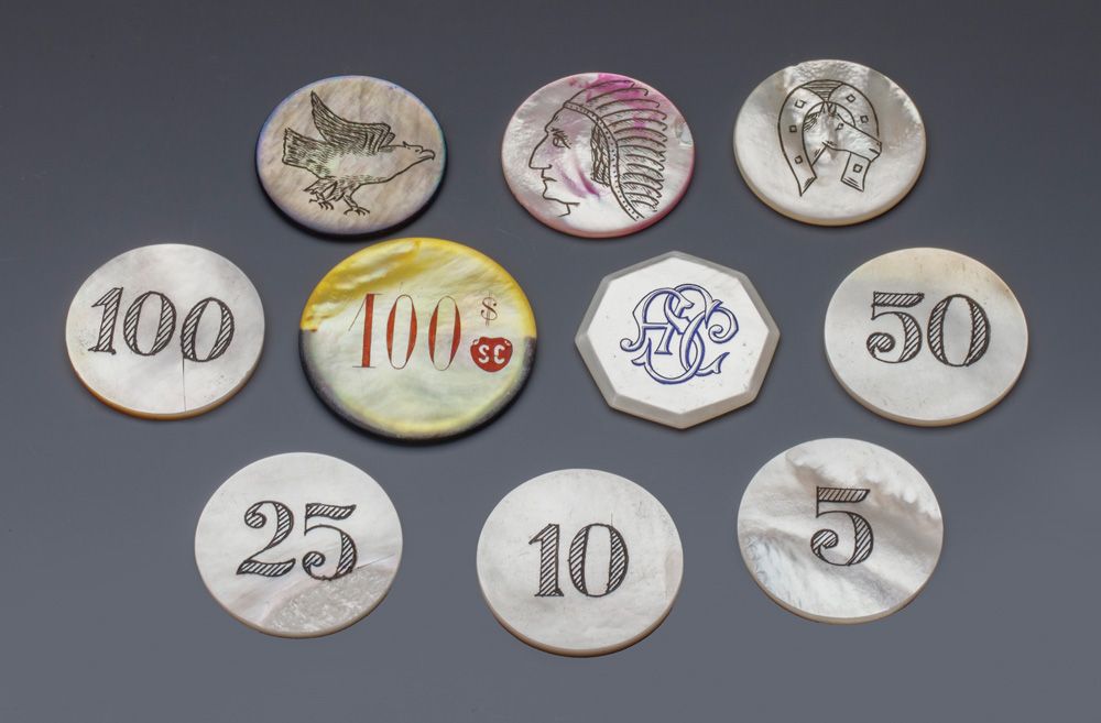 Lot of 10 Scare Mother of Pearl (French Style) Gaming Chips. Lot of ten mother of pearl chips consisting of 1 rare multicolor $100 chip in green and yellow with red heart and "SC" in heart; 5, 10, 25, 50 and 100 matching chips (100 has crack and 25 has defect on one side); a horsehead and horseshoe chip; eagle chip with blue edge; Indian chief (with chip and reddish staining); and a $100 chip with "ACS" monogram. Circa 1880s.