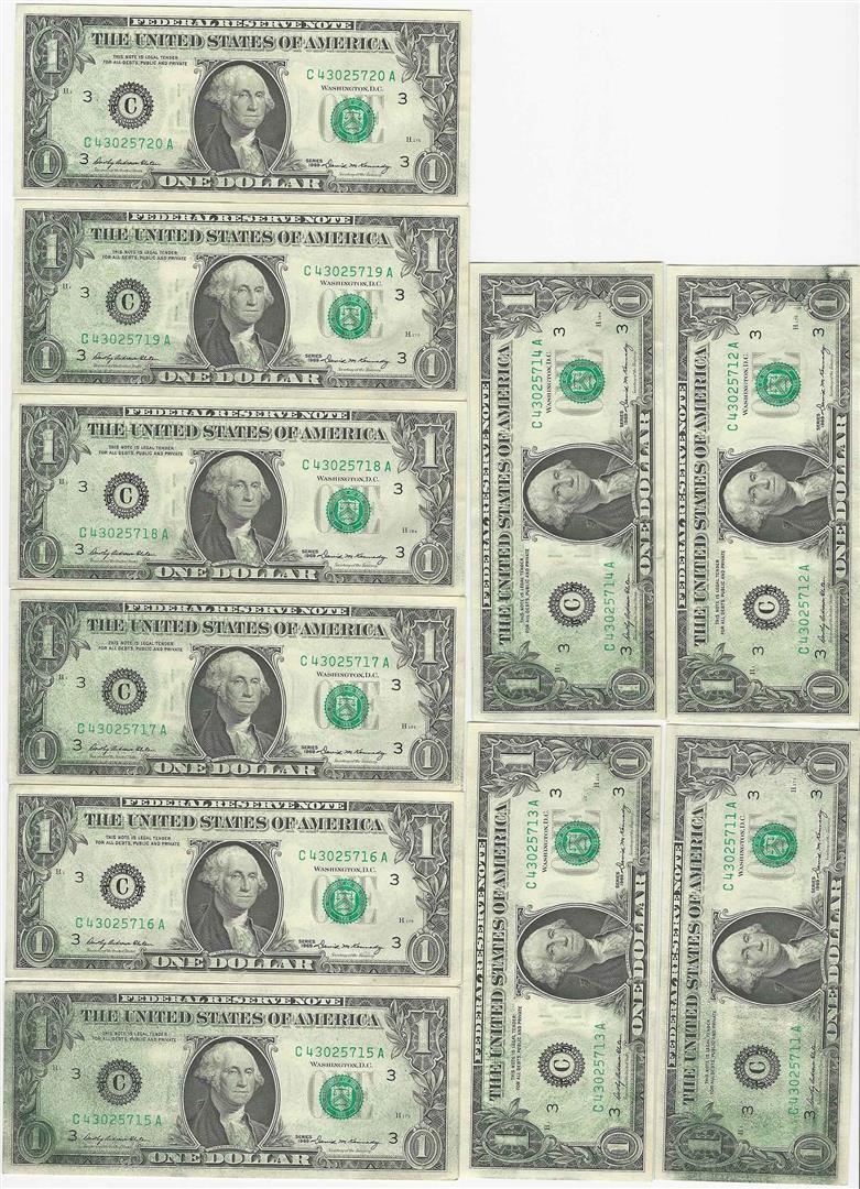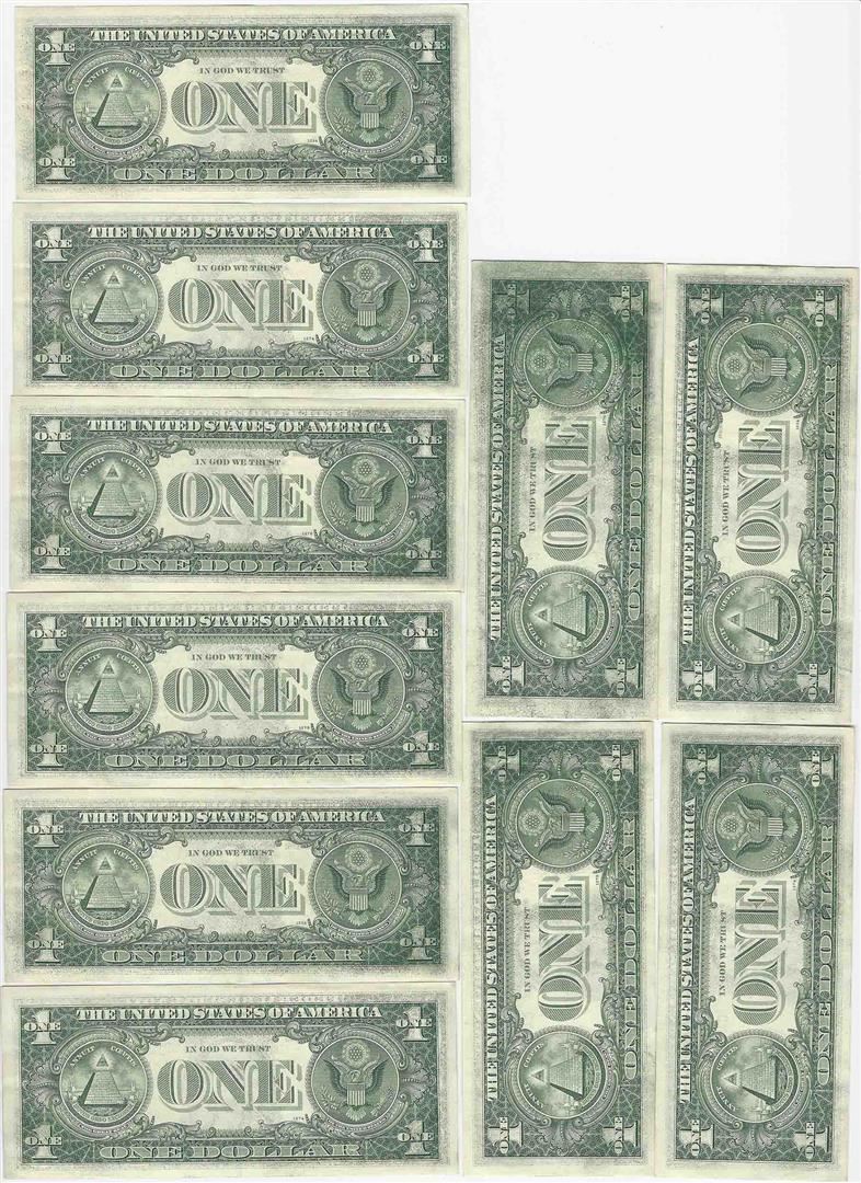 One Lot of (10) Sequential 1969 $1 FRN Inking ERRORs.